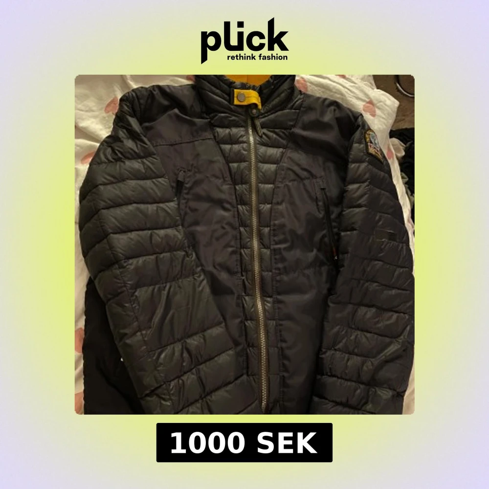 Säljer en svart quiltad jacka från Parajumpers med dragkedja och hög krage. Jackan har långa ärmar och en gul detalj vid halsen. Perfekt för kyligare dagar.