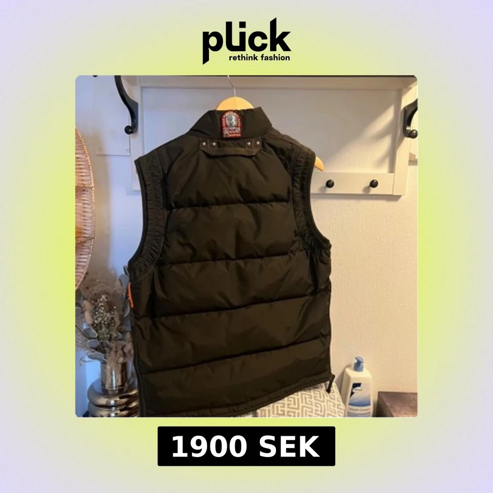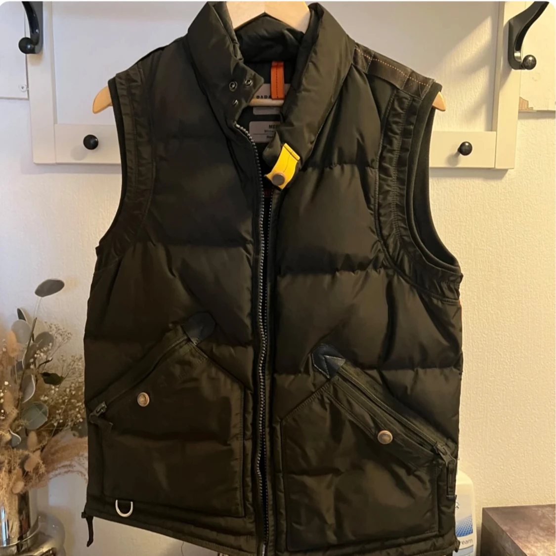 Säljer en svart dunväst från Parajumpers med hög krage och dragkedja framtill. Västen har två stora fickor med knappar och dragkedjor samt en gul detalj vid halsen. Perfekt för lager-på-lager under kyliga dagar.