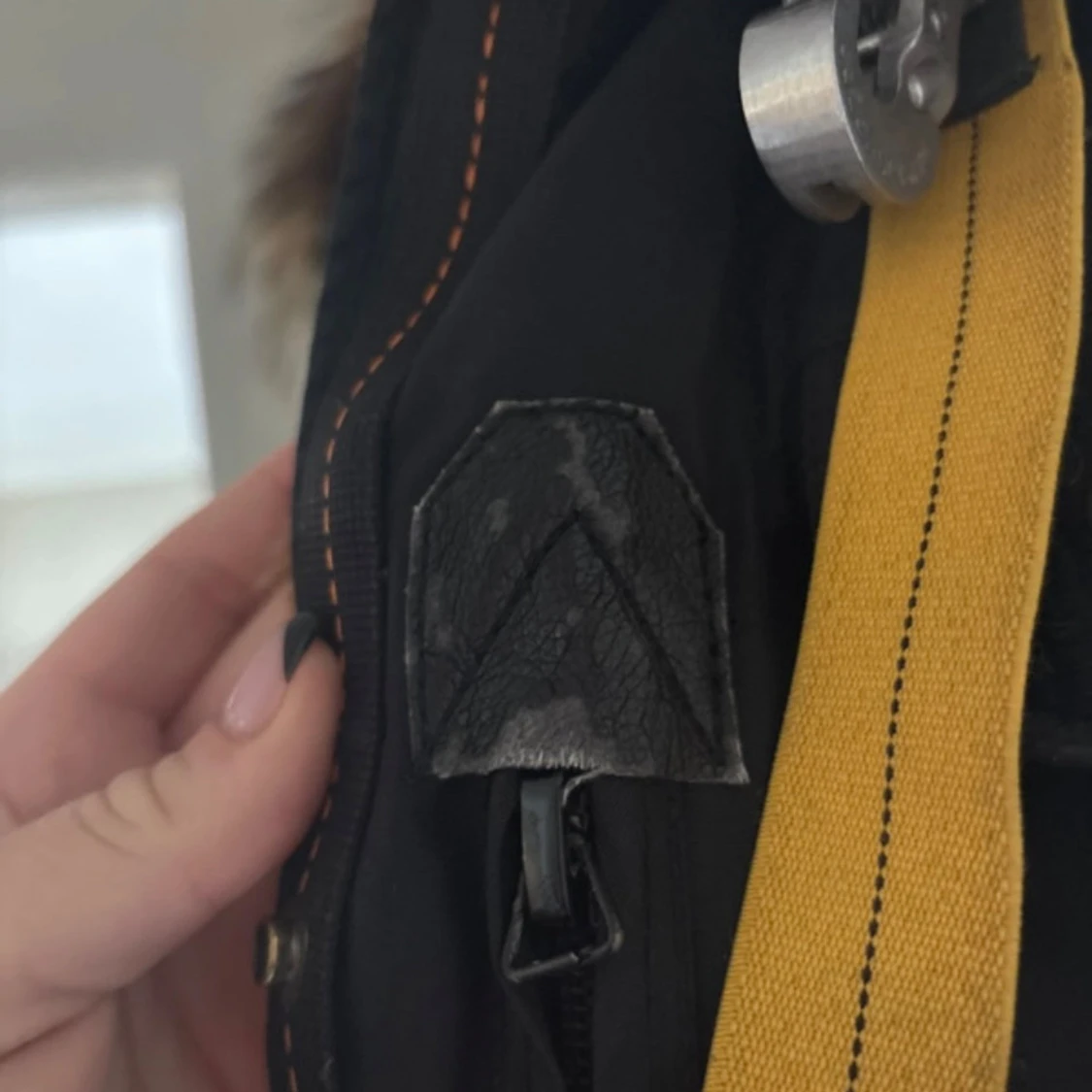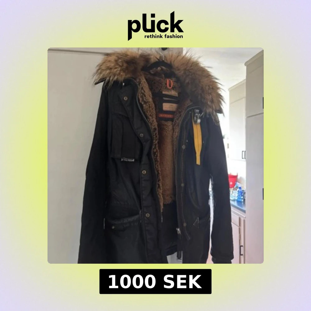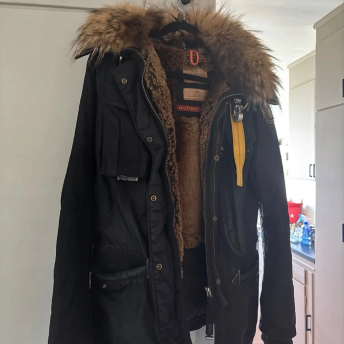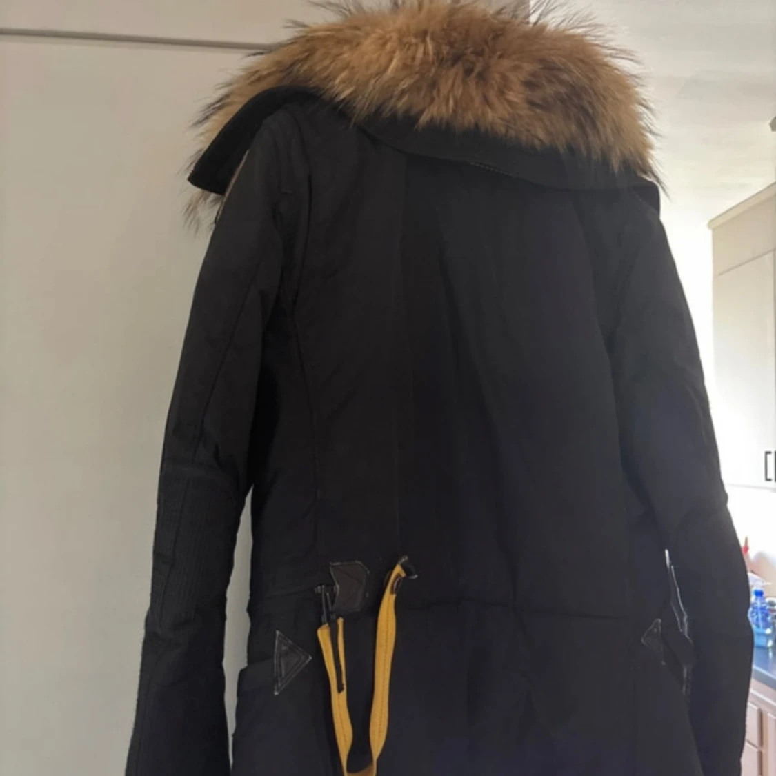 Säljer en svart parkas från Parajumpers med fluffig brun päls runt huvan och varm dunfyllning. Jackan har flera fickor, dragkedja, knappar och den ikoniska gula remmen vid kragen. Insidan är fodrad med mjuk teddy och jackan är perfekt för kalla dagar. i fint skick! Men lite slitage på vissa skinndetsljer , det jag tagit bild på. Inte använd supermycket, men slitaget uppkom tyvär vid en rengöring av ja