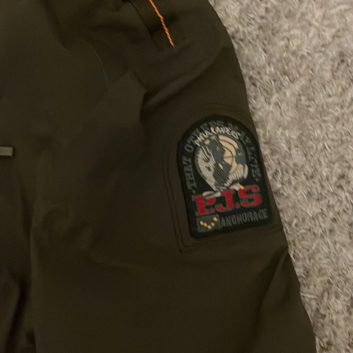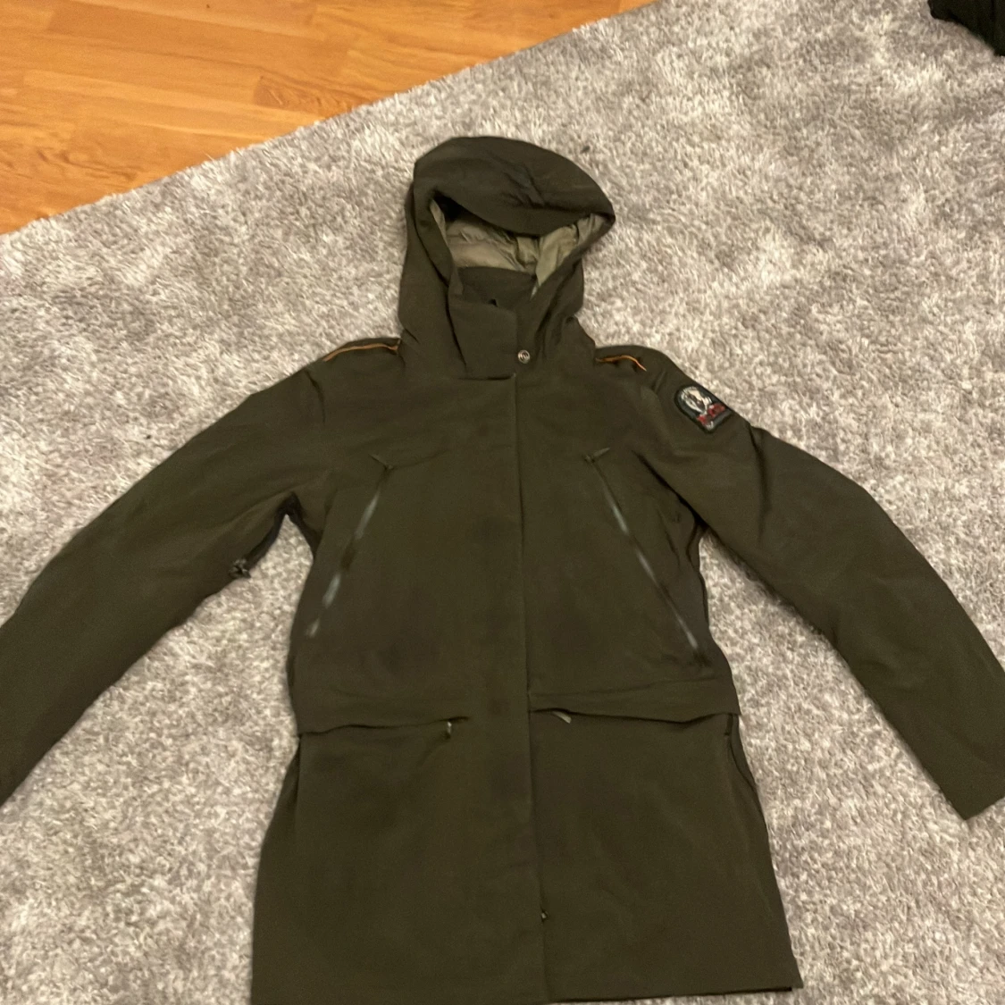 Säljer en grön parkajacka från Parajumpers med huva och cool patch på ärmen. Jackan har praktiska fickor med dragkedja och en stilren design. Perfekt för kyligare dagar! En av dragkedjorna är sönder men går enkelt att fixa.