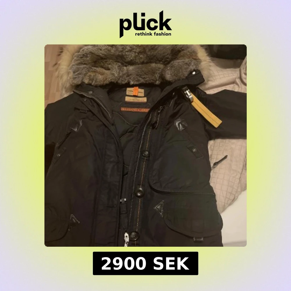 Säljer en svart parkajacka från Parajumpers med pälsfodrad huva och dragkedja. Jackan har flera fickor och en gul detalj vid halsen. Perfekt för kalla dagar.