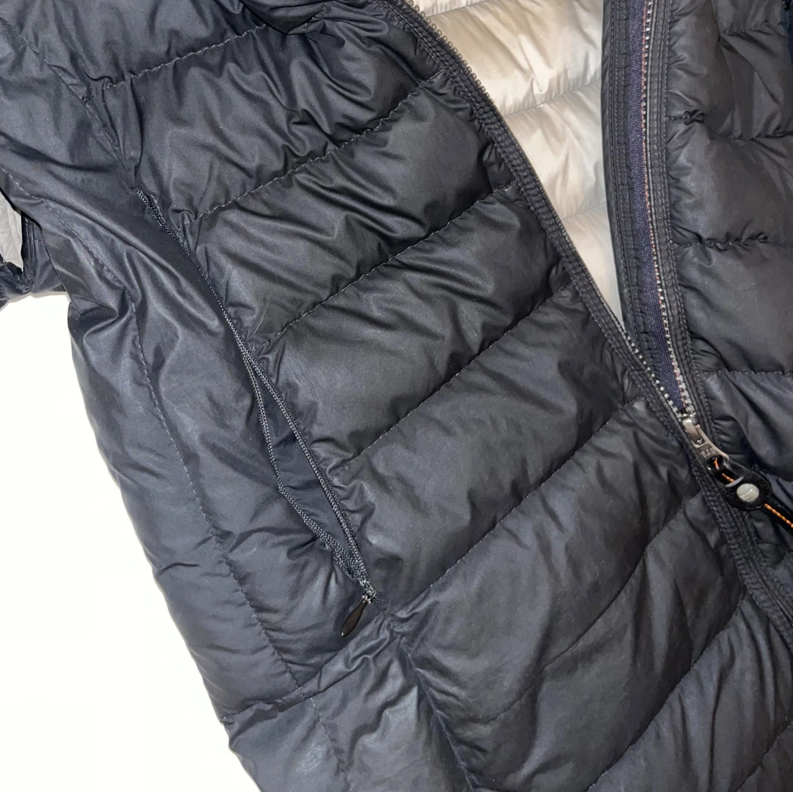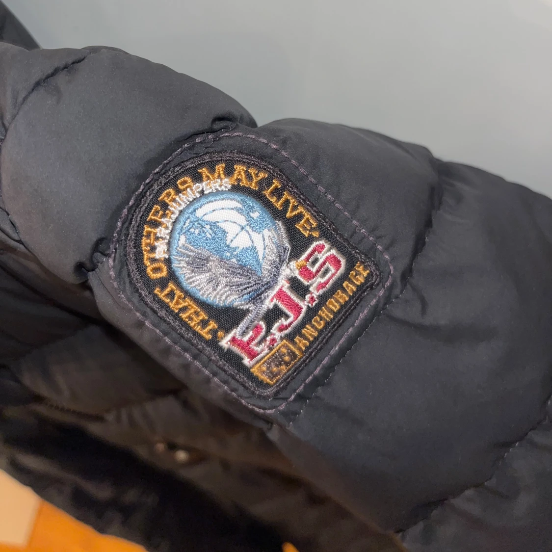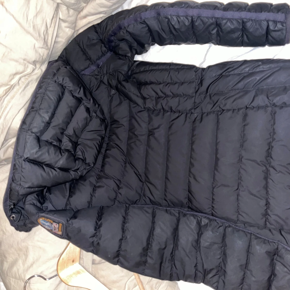 Säljer en svart, lång och lätt dunjacka från Parajumpers i storlek S. Jackan har huva, dragkedja framtill och klassisk Parajumpers-logga på ärmen. Perfekt för kalla dagar och riktigt snygg passform. Ena dragkedjan på fickan högre upp är sönder (se sista bild) , men inget som förstör hur jackan ser ut på och går säkert att fixa för en billigare peng!