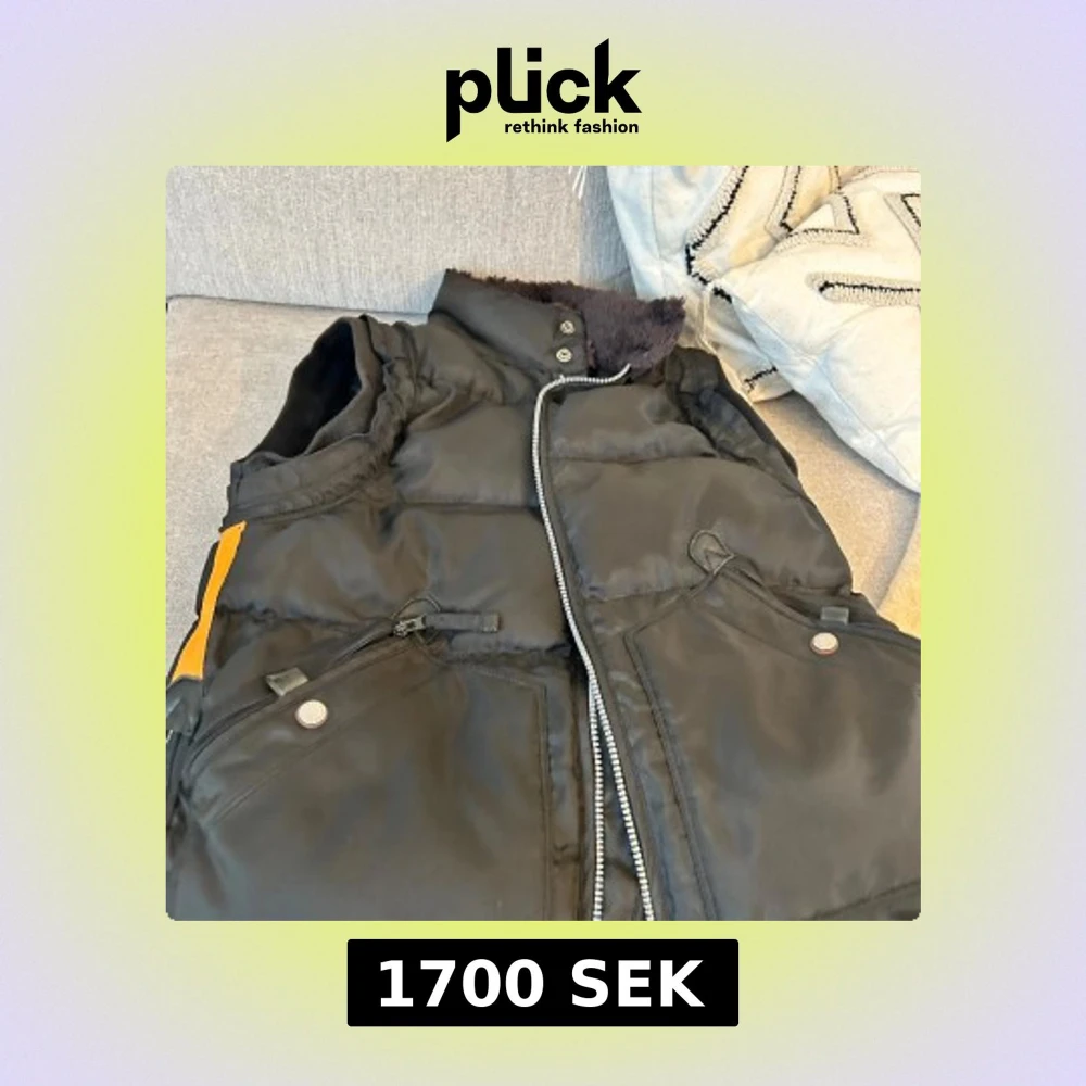Säljer en svart dunväst från Parajumpers med hög krage fodrad i mjuk pälsimitation. Västen har dragkedja framtill, två stora fickor med både dragkedja och knapp samt orange detalj på sidan. Perfekt för lager-på-lager under kalla dagar. En av fickans dragkedja är sönder men går o fixas nånstans kommer kosta runt 300-400 Säljer för att den är liten på mig och vill bli av med den den är äkta såklart.