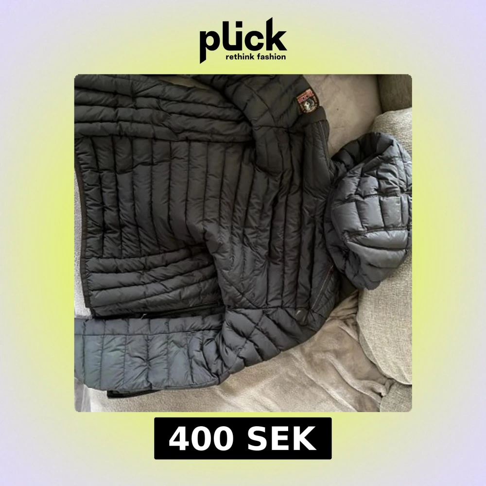 Säljer en svart dunjacka från Parajumpers med huva och quiltad design. Jackan har lång ärm och är fodrad i ljus färg på insidan. Perfekt för kyliga dagar och har en klassisk look med diskret logga på axeln.