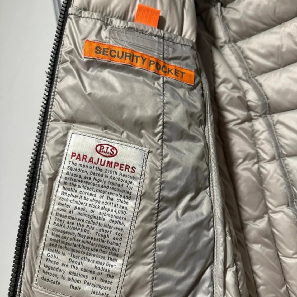 Snygg svart dunjacka från Parajumpers i storlek XS. Jackan är quiltad och superlätt, med dragkedja framtill och två sidofickor med dragkedja. Insidan är ljusgrå och har en praktisk innerficka märkt 'Security Pocket'. Perfekt för höstliga dagar.