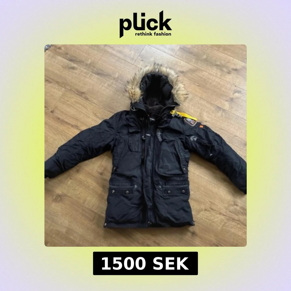 Säljer en svart vinterjacka från Parajumpers med pälsfodrad huva och flera praktiska fickor. Jackan har en dragkedja och knappar framtill samt en gul remdetalj på axeln. Perfekt för kalla dagar!