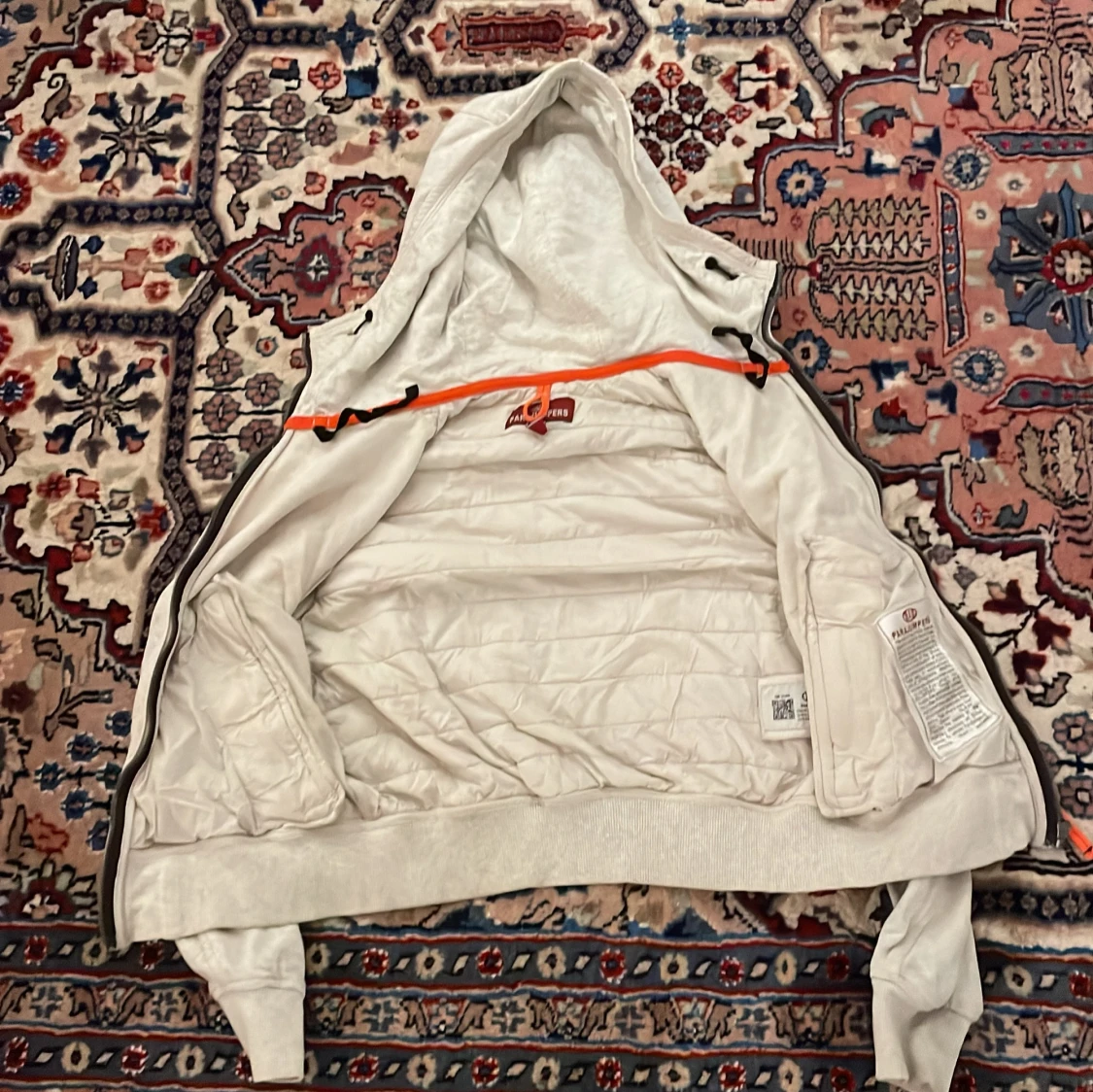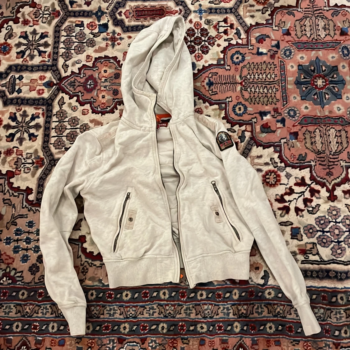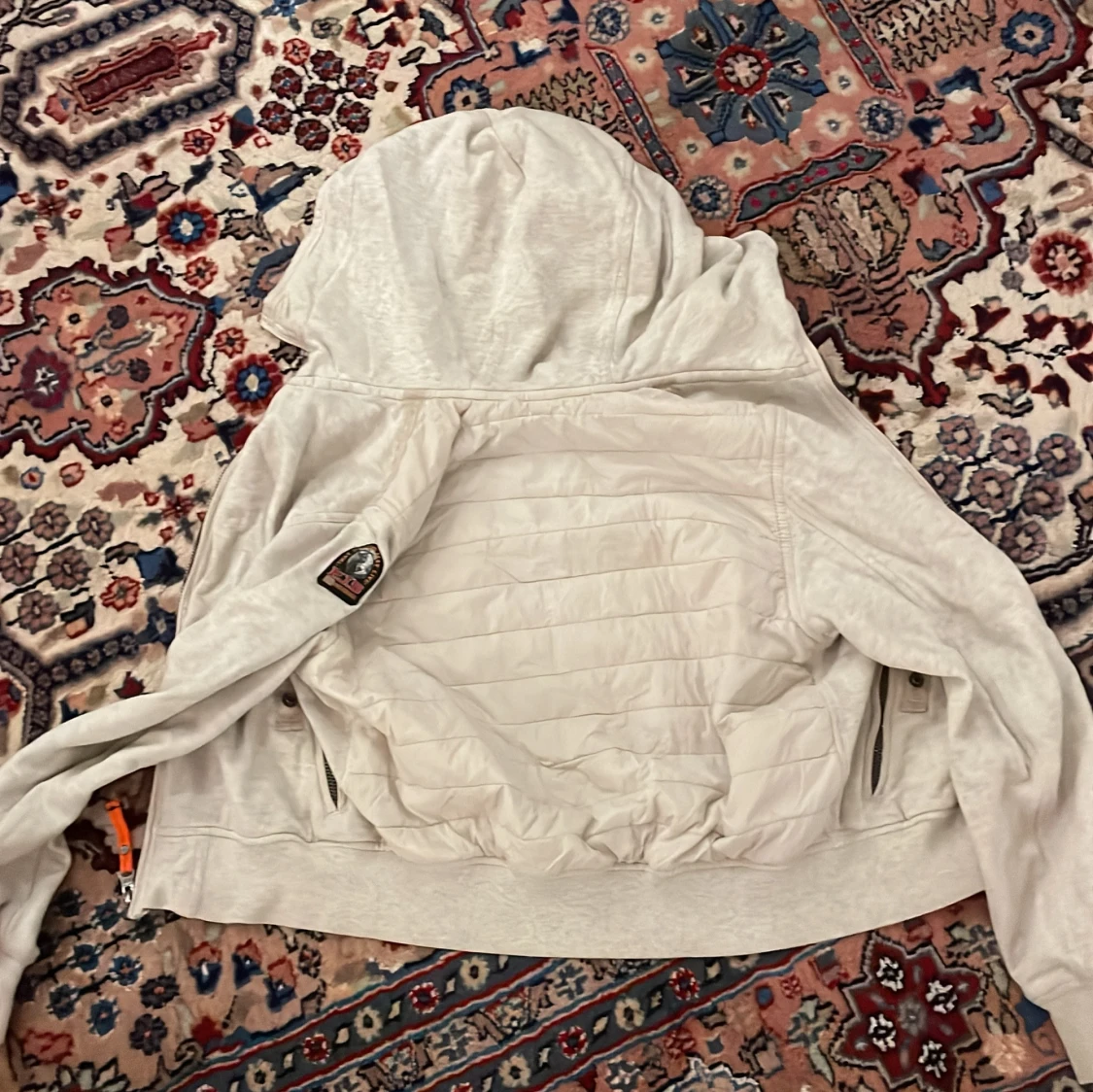 Snygg vit hoodiejacka från Parajumpers med quiltad insida och två dragkedjeförsedda fickor fram. Jackan har ribbade muddar, huva med snörning och coolt patch på ärmen. Perfekt för dig som gillar streetwear och vill ha något som sticker ut.