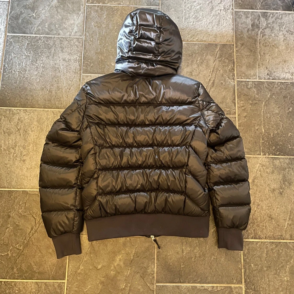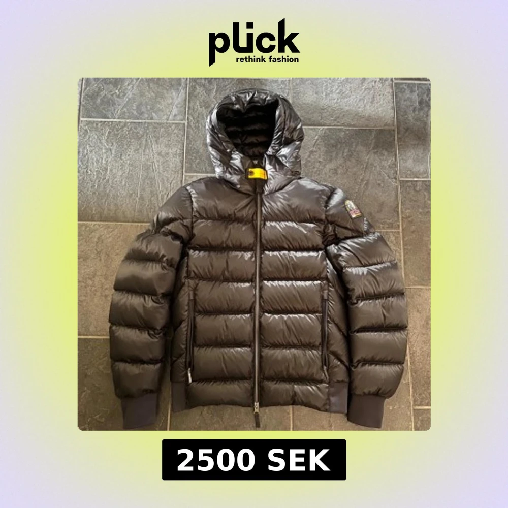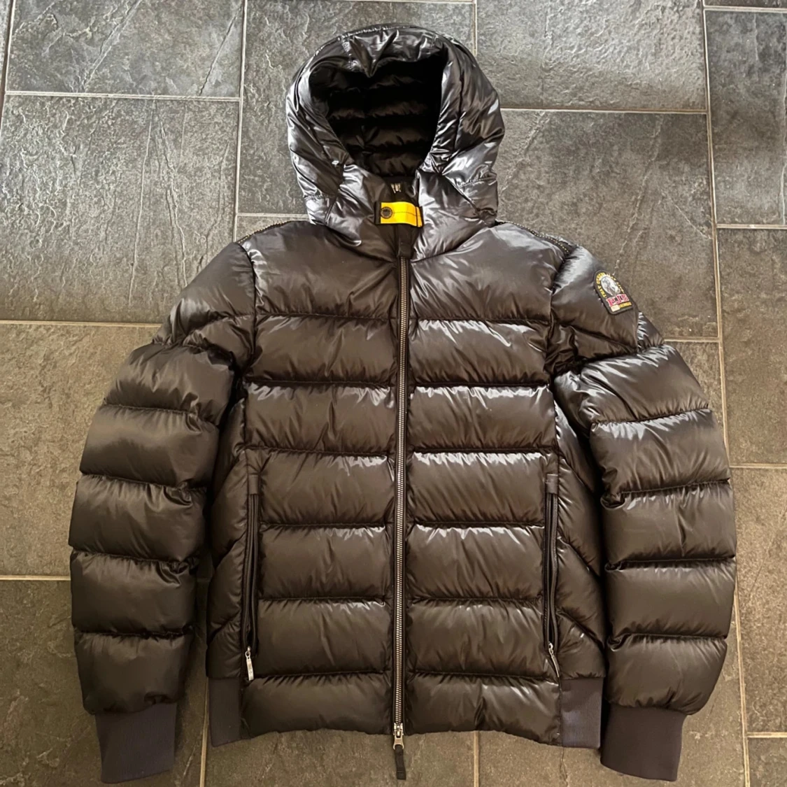 Säljer en svart, glansig dunjacka från Parajumpers med huva och ikonisk gul detalj vid halsen. Jackan har quiltad design, dragkedja framtill och ribbade muddar. Perfekt för kalla dagar och riktigt snygg streetstil.