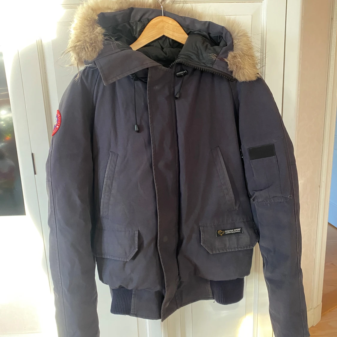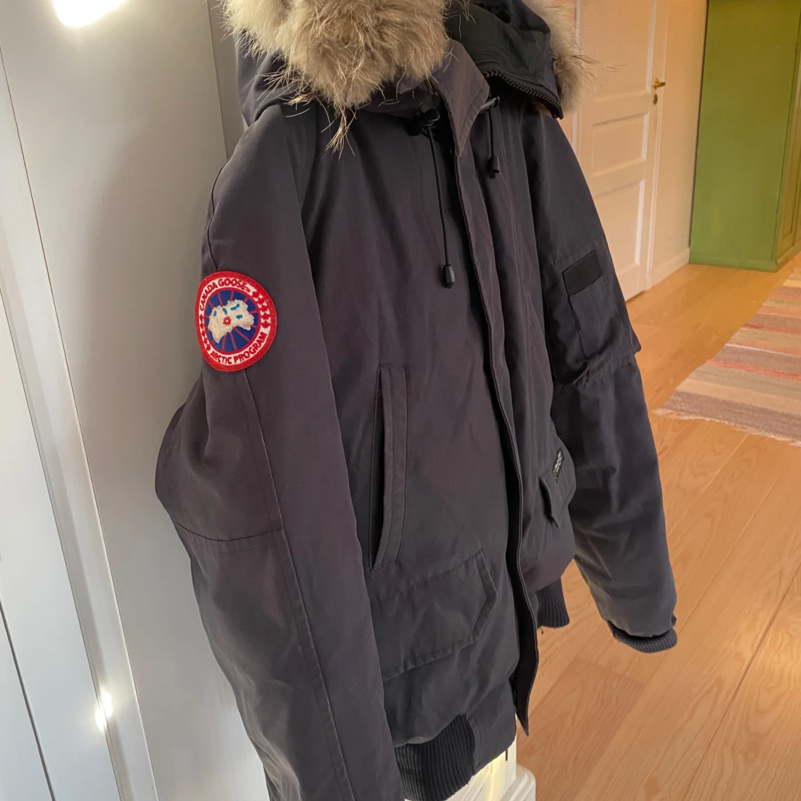 Säljer en svart parkajacka från Canada Goose i mycket bra skick. Jackan har en avtagbar huva med äkta päls och flera praktiska fickor. Perfekt för kalla vinterdagar!