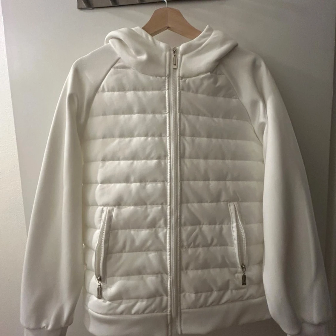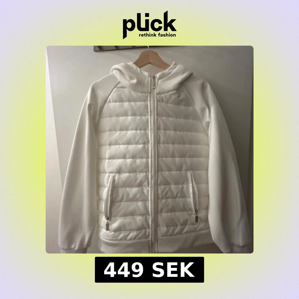 Säljer en fräsch vit pufferjacka med quiltad framsida och dragkedja. Jackan har huva, två fickor med dragkedja och ribbade muddar vid ärmslut. Perfekt för dig som gillar stilren och clean look.