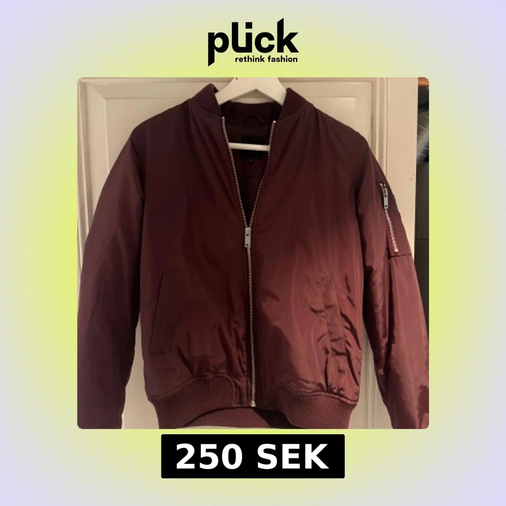 Säljer en snygg vinröd bomberjacka från New Look. Jackan har en dragkedja framtill och en ficka med dragkedja på ärmen. Den är tillverkad i ett glansigt material och har ribbade muddar vid ärmslut och nederkant. Perfekt nu till våren! Den är i storlek 6 vilket jag tror är samma som S i EU storlek, passar mig som vanligtvis bär S!