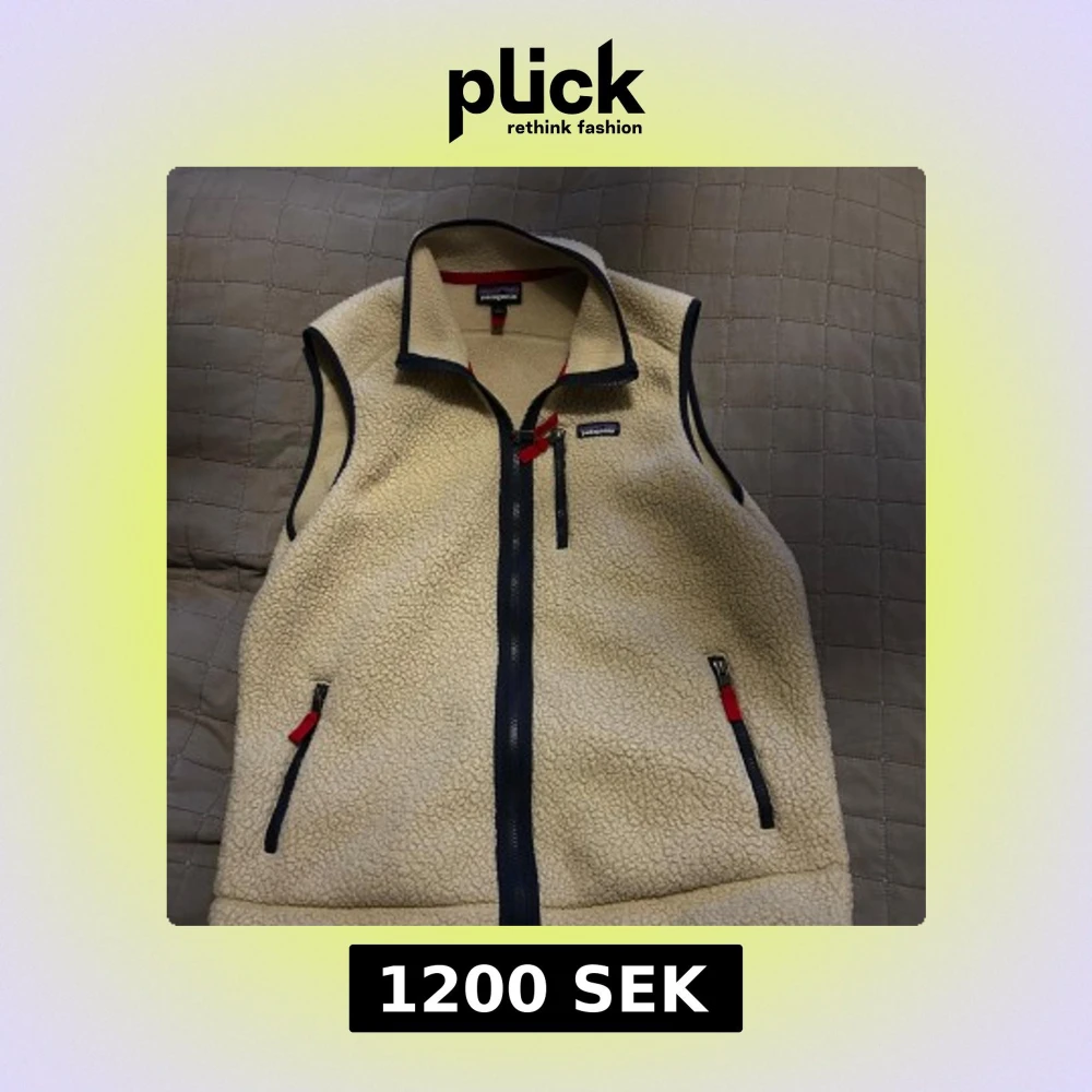 Säljer en beige fleeceväst från Patagonia med dragkedja och praktiska fickor. Västen har mörkblå detaljer och röda dragkedjor som ger en snygg kontrast. Helt ny använd Max 2-3 gånger.