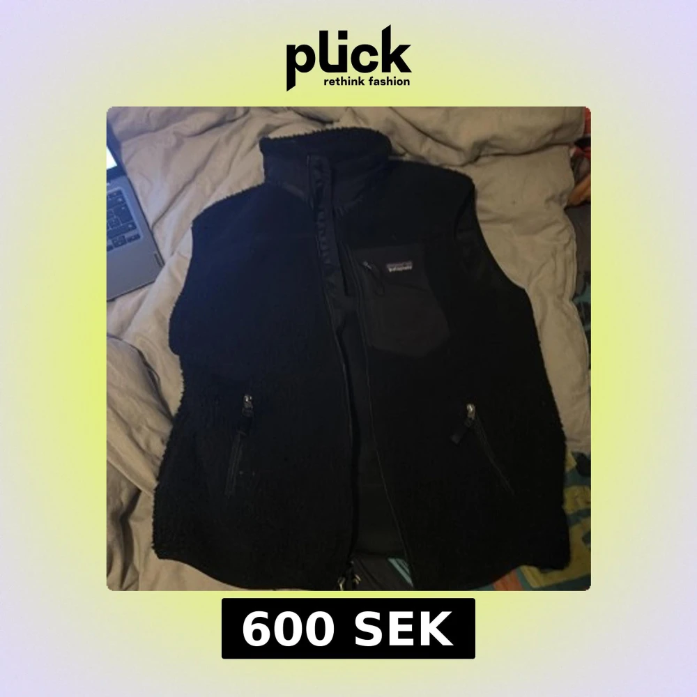 Svart fleeceväst från Patagonia med hög krage och dragkedja framtill. Utsidan är fluffig och mjuk, med två sidofickor med dragkedja och en bröstficka med logga. Perfekt för lager-på-lager och chill stil.
