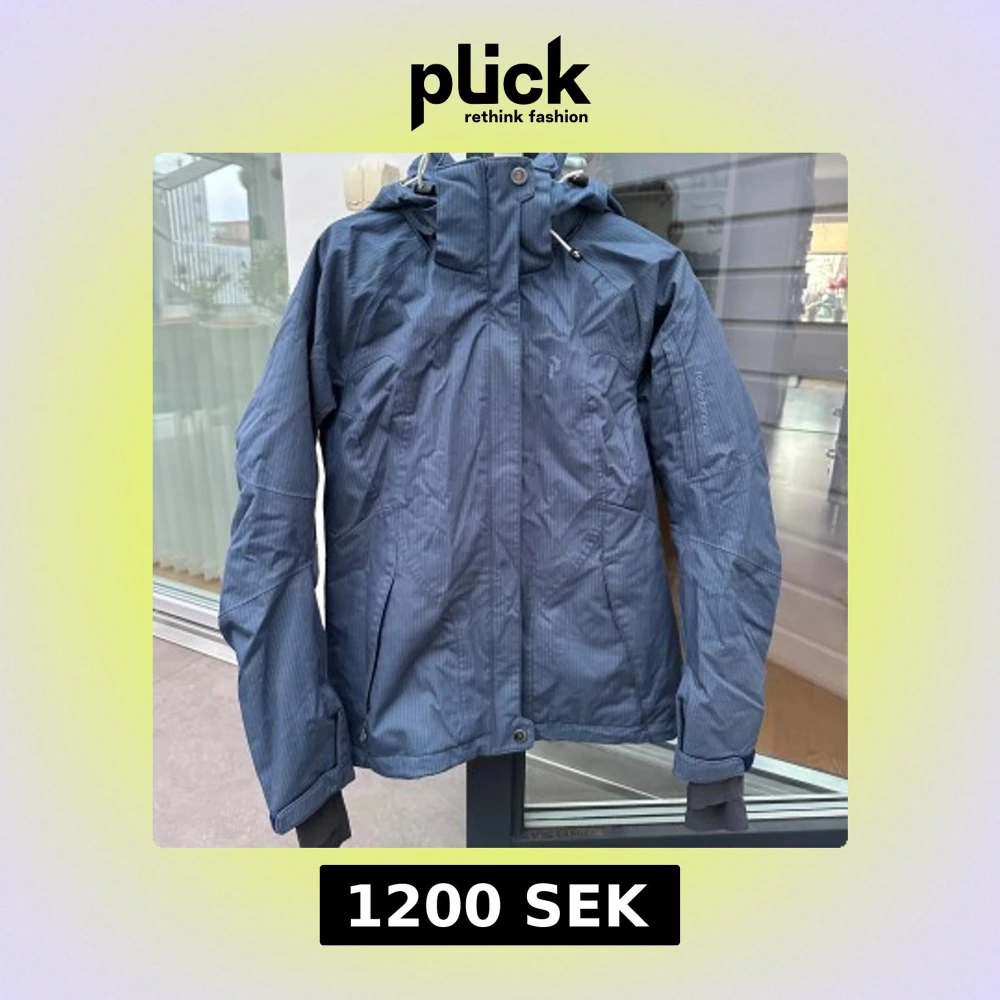 Peak Performance skidjacka i blått med diskret randigt mönster. Jackan har huva, dragkedja och knappar framtill samt praktiska fickor. Storlek S bara använt två skid säsonger.