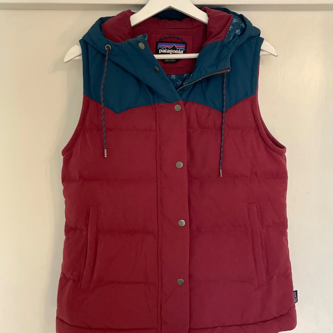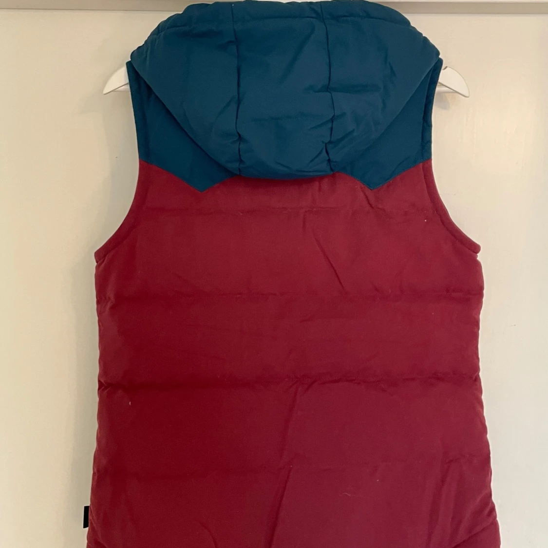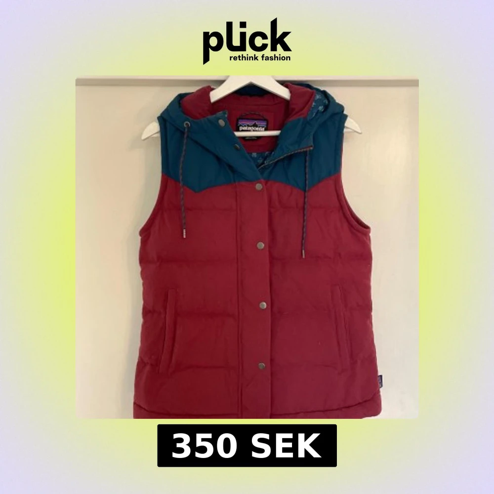 Snygg dunväst från Patagonia i rött med blå axelparti och huva. Västen har dragkedja och tryckknappar framtill samt två fickor. Perfekt för lager-på-lager och chill utomhus. Klassisk streetstil med sportig vibe.
