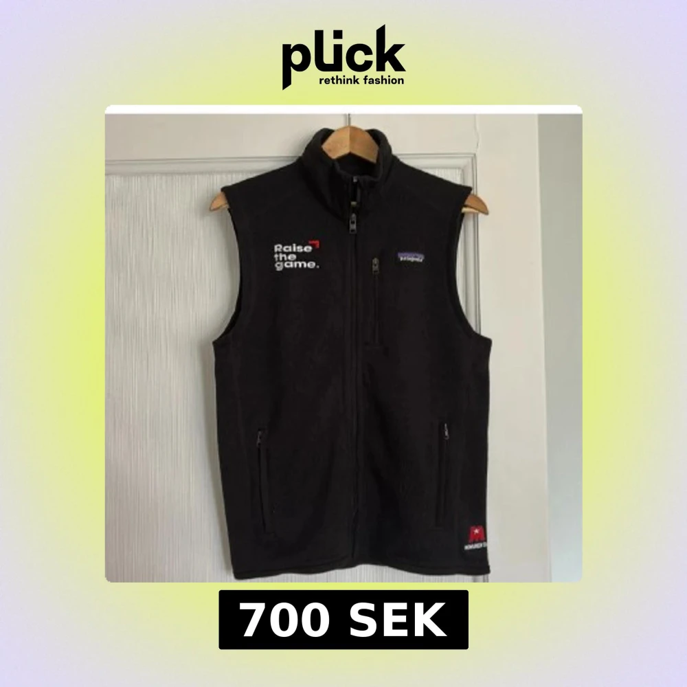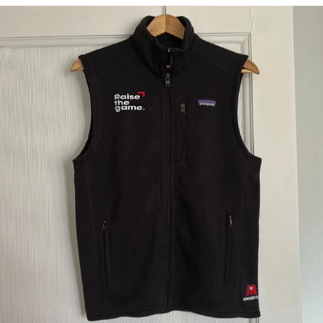 Svart fleeceväst från Patagonia med hög krage och dragkedja framtill. Västen har broderad text 'Raise the game.' på bröstet och två sidofickor med dragkedja. Perfekt för lager-på-lager och outdoor. Snygg, enkel design med diskret logga.