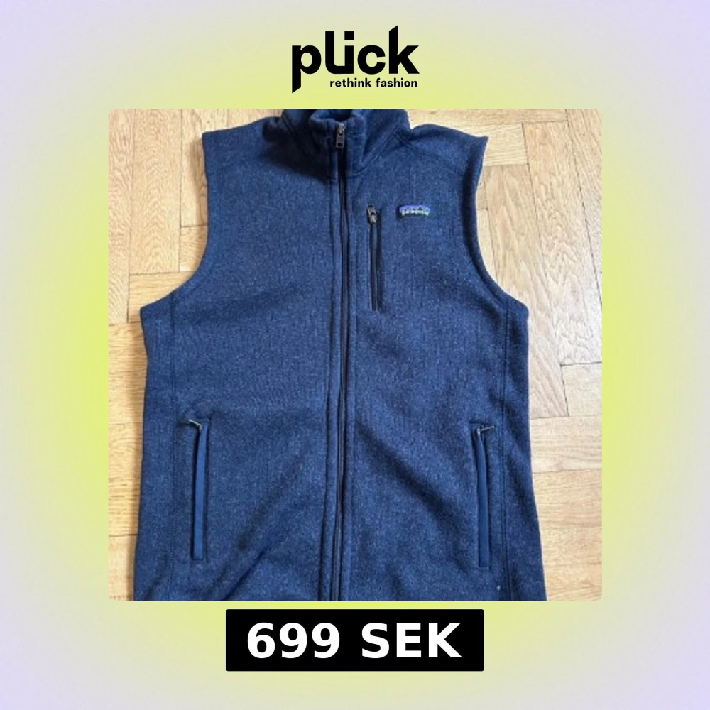 Snygg mörkblå fleeceväst från Patagonia med hel dragkedja framtill och två sidofickor med dragkedja. Västen har en liten bröstficka med dragkedja och klassisk ståkrage.🌟