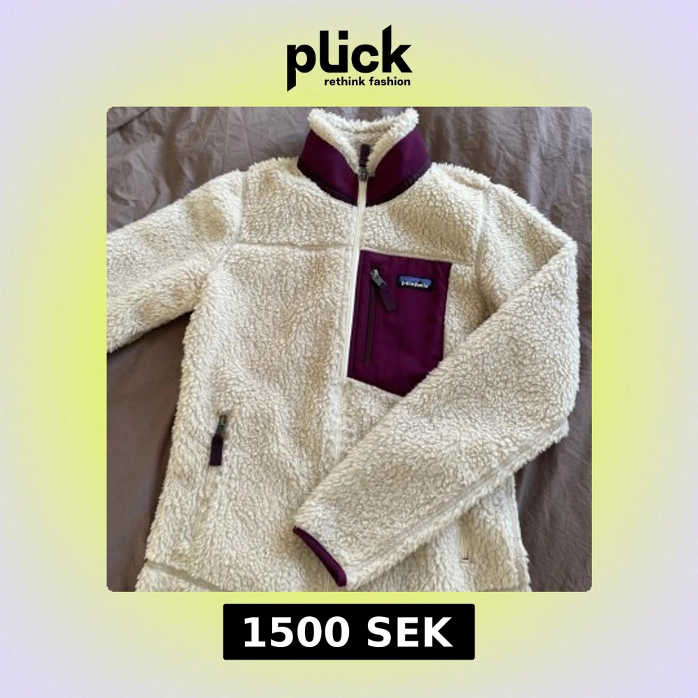 Säljer en supermysig vit teddyjacka från Patagonia med lila detaljer. Jackan har en dragkedja framtill och en praktisk bröstficka med dragkedja. Perfekt för kyliga dagar! 🐻