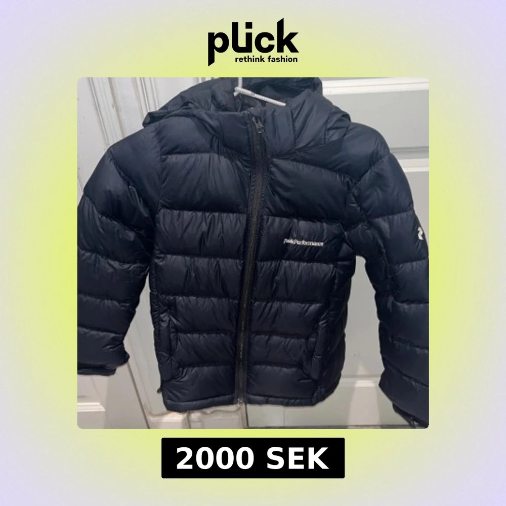 Svart dunjacka från Peak Performance med huva och dragkedja framtill. Perfekt för kalla dagar och riktigt skön att bära. Klassisk modell som funkar till det mesta. Storlek 150