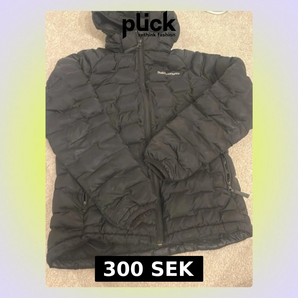 Svart pufferjacka från Peak Performance med huva och dragkedja framtill. Jackan har quiltad design och två sidofickor med dragkedja. Perfekt för kalla dagar och har en stilren look som funkar till det mesta. 2 små hål som är lagade på jackan, därav priset . Storlek 160 (xs)