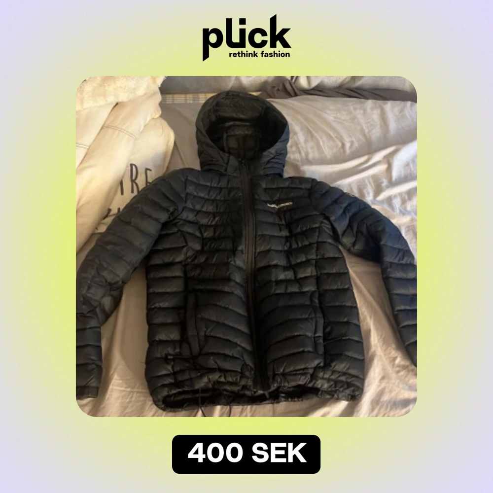 Jacka är i storlek 160 med huva och rymliga fickor använt 1 gång och jackan är i dun men håller värmen väldigt bra💕