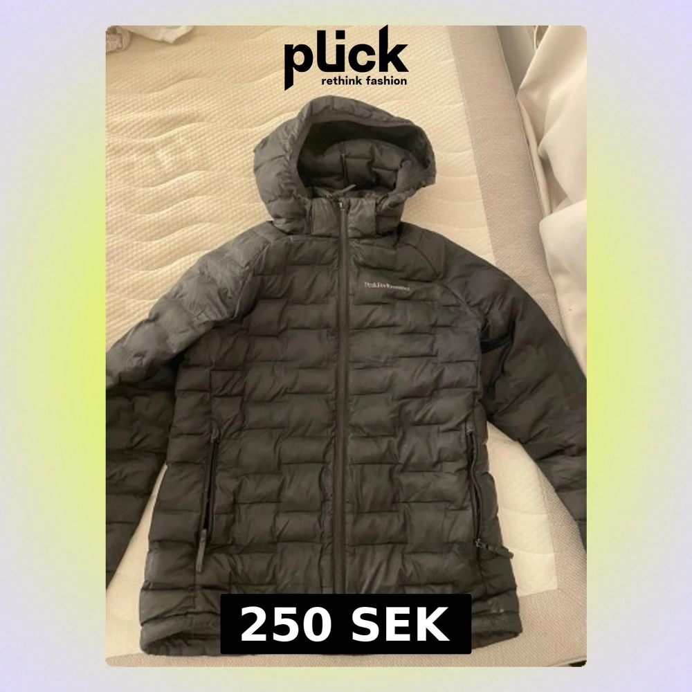 Snygg svart dunjacka från Peak Performance med huva och dragkedja framtill. Jackan har två sidofickor (ena fickan har ett hål, inget som syns på utisidan) med dragkedja och diskret logga på bröstet. Perfekt för kalla dagar och enkel att matcha med allt.