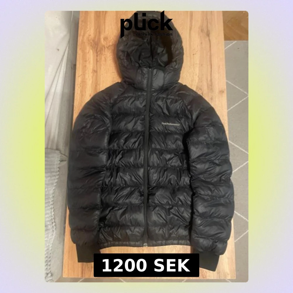 Svart dunjacka från Peak Performance med huva och dragkedja framtill. Jackan har quiltad design och ribbade muddar vid ärmslut. Perfekt för kalla dagar och har en clean look med diskret logga på bröstet.