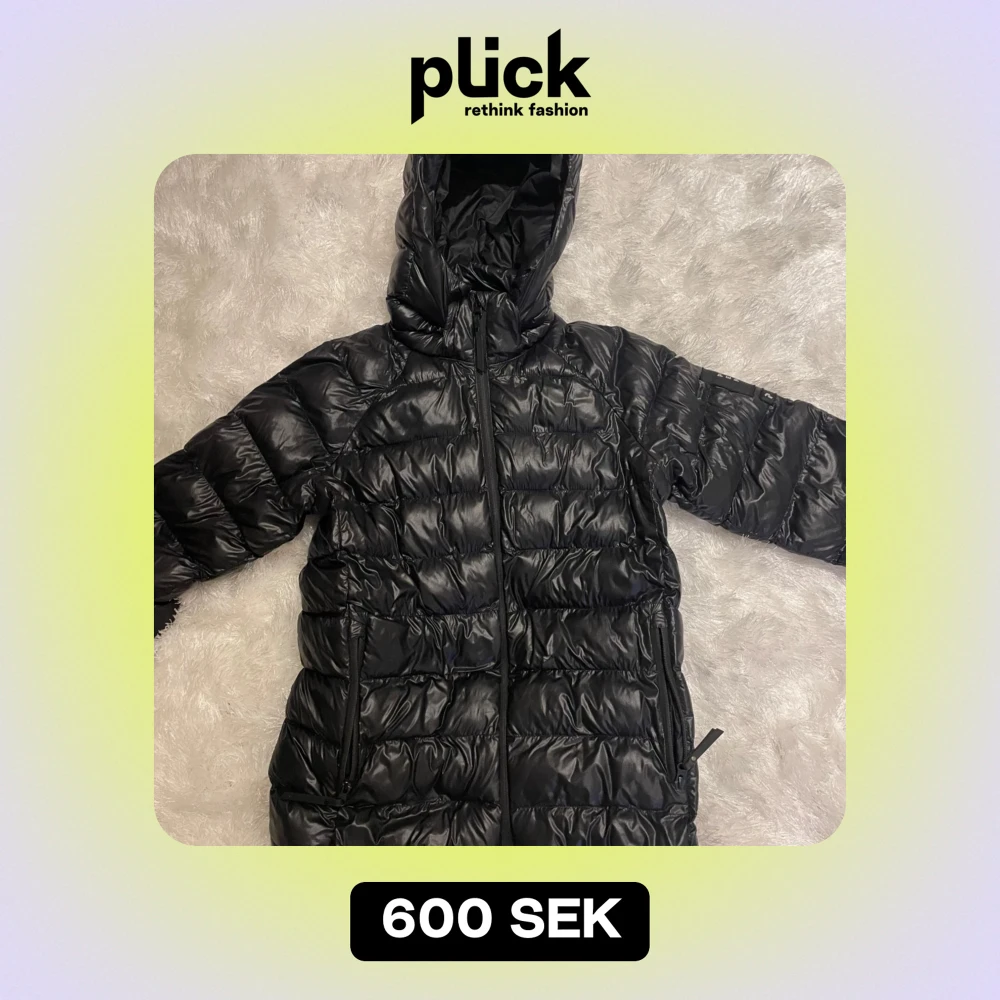 Säljer en svart glansig dunjacka från Peak Performance. Den är perfekt för kalla vinterdagar med sin varma och quiltade design. Jackan har en praktisk dragkedja och en huva för extra skydd mot väder och vind. Det finns en liten reva på framsidan, men annars i bra skick.