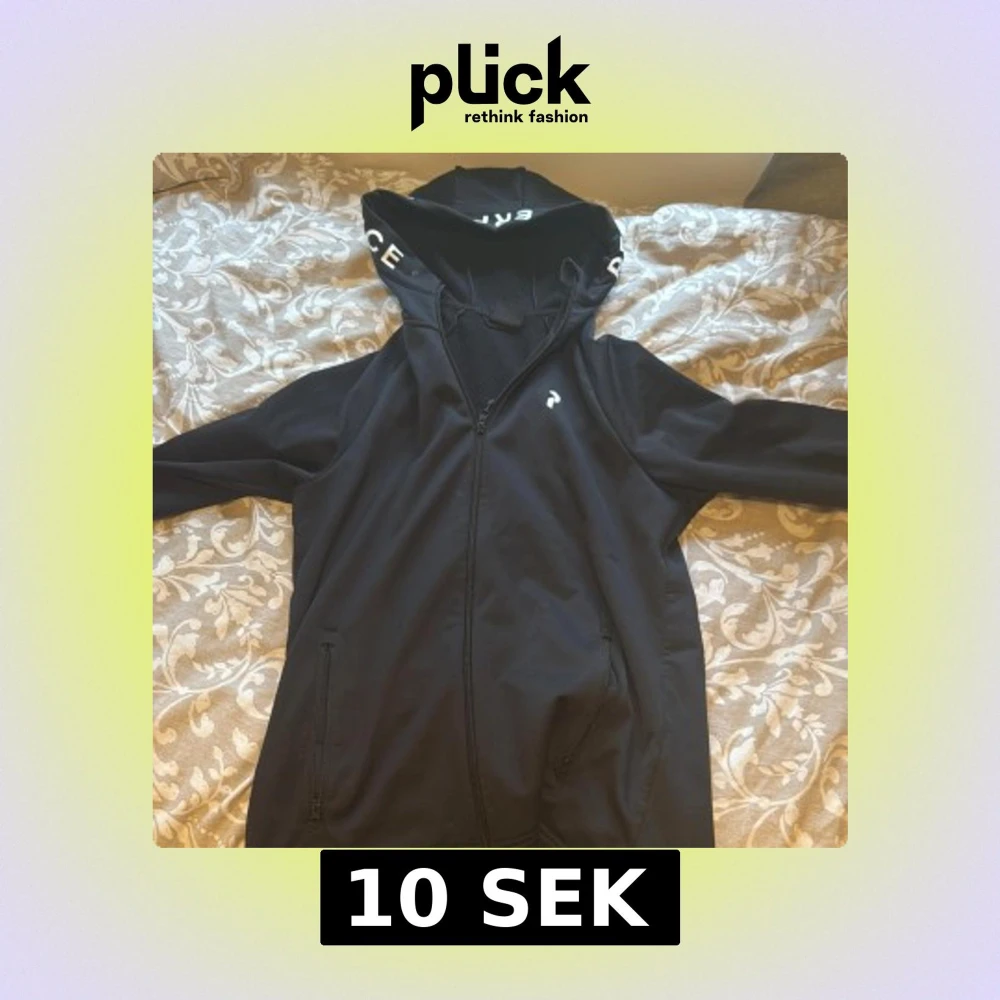 Säljer en svart hoodiejacka från Peak Performance med dragkedja och huva. Jackan har logga på bröstet och text på huvan. Perfekt för träning eller chill. Två fickor med dragkedja framtill.