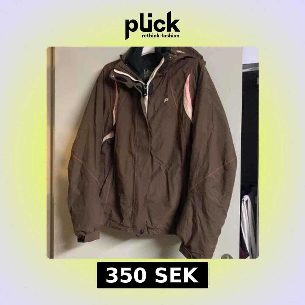 Säljer en brun jacka från Peak Performance med rosa och vita detaljer. Jackan har en dragkedja och är långärmad, perfekt för höst och vinter. Den har en logotyp på bröstet och en praktisk huva.