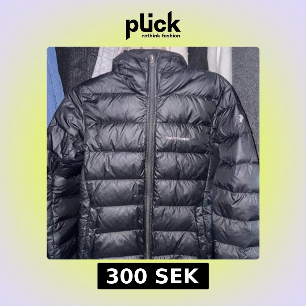 Säljer en svart dunjacka från Peak Performance med huva och dragkedja framtill. Jackan är quiltad och har en sportig look, perfekt för kyliga dagar. Klassisk design med diskret logga på bröstet.