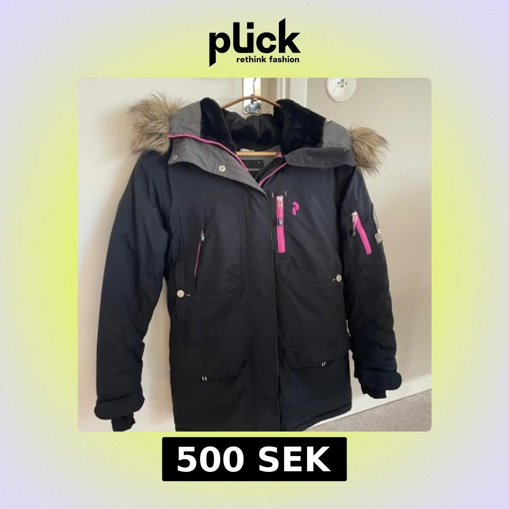 Säljer en svart vinterjacka från Peak Performance med huva och fuskpäls. Jackan har rosa dragkedjor, flera fickor och patch på ärmen. Perfekt för kalla dagar och snygg detalj med pälsen på huvan.