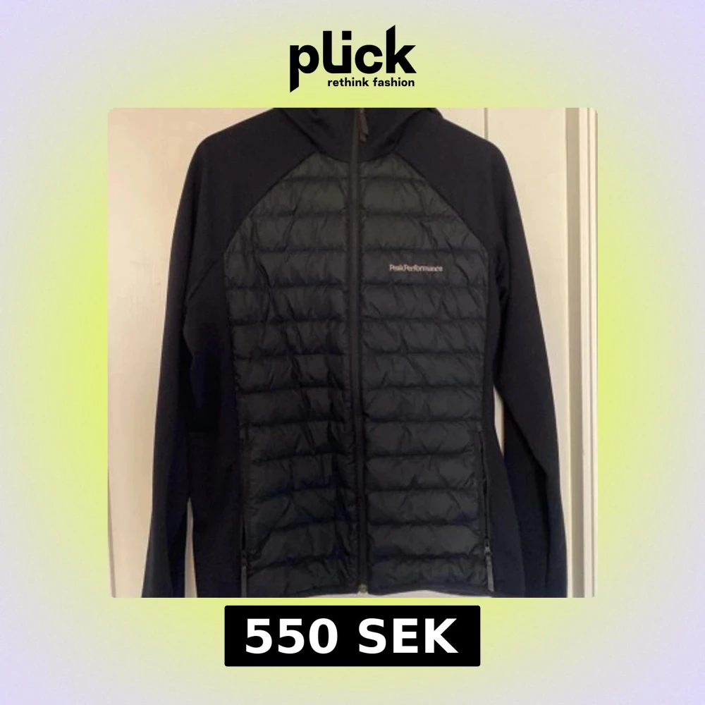 Svart hybridjacka från Peak Performance med quiltad front och rygg samt huva. Jackan har dragkedja framtill och två sidofickor med dragkedja. Perfekt för lager-på-lager och snygg sportig look. Köpte här på Plick