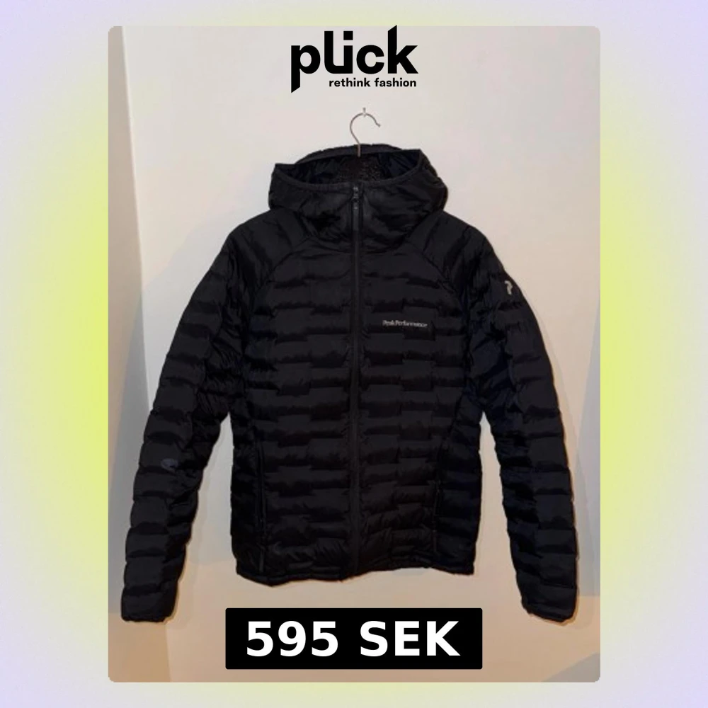 Svart dunjacka från Peak Performance i storlek M. Jackan har huva, dragkedja framtill och ett quiltat mönster. Perfekt för kalla dagar och har en clean, sportig look. Materialet är syntet och dun, vilket gör den både lätt och varm. Jackan har en defekt på höger arm som är lagat med en laglapp. Syns lite grann men går att laga bättre. Annars i okej skick!