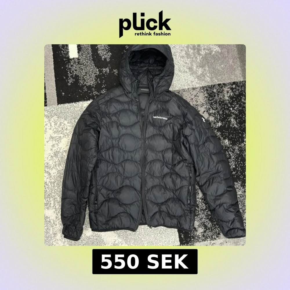 Säljer en svart dunjacka från Peak Performance med dragkedja och huva. Jackan har ett quiltat mönster och är perfekt för hösten/våren. Den har långa ärmar och en stilren design med logotyp på bröstet och ärmen.