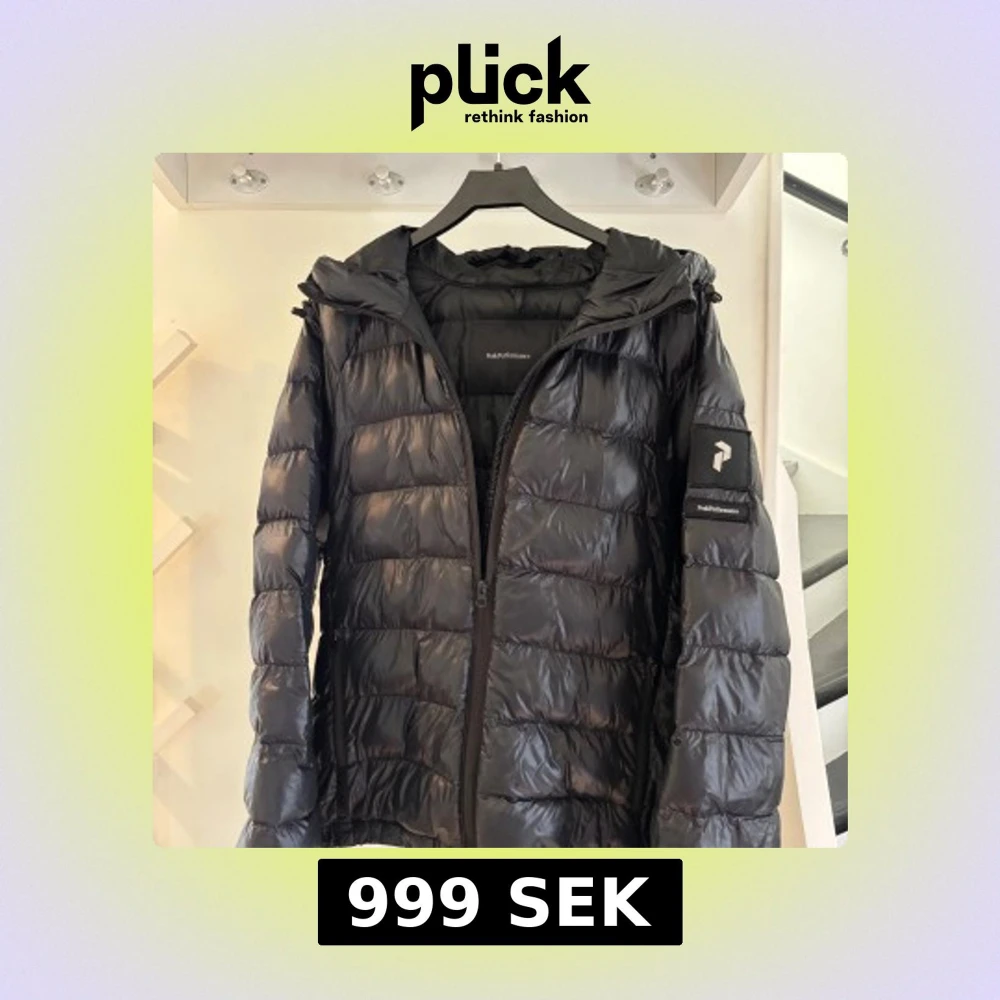 Svart dunjacka från Peak Performance med glansig finish och klassisk quiltad design. Jackan har huva, dragkedja framtill och logotyp på ärmen. Perfekt för kalla dagar. Passar även M.