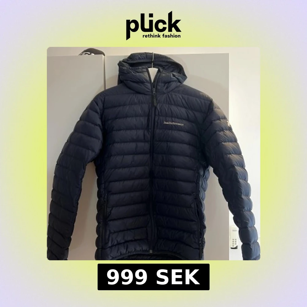 Säljer en mörkblå dunjacka från Peak Performance med huva och dragkedja. Jackan är lätt, har quiltad design och två sidofickor med dragkedja. Jackan är mycket bra skick och är i storlek L.