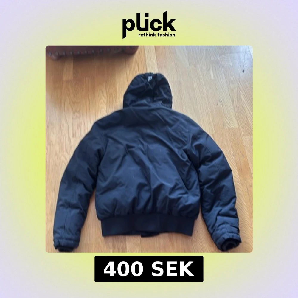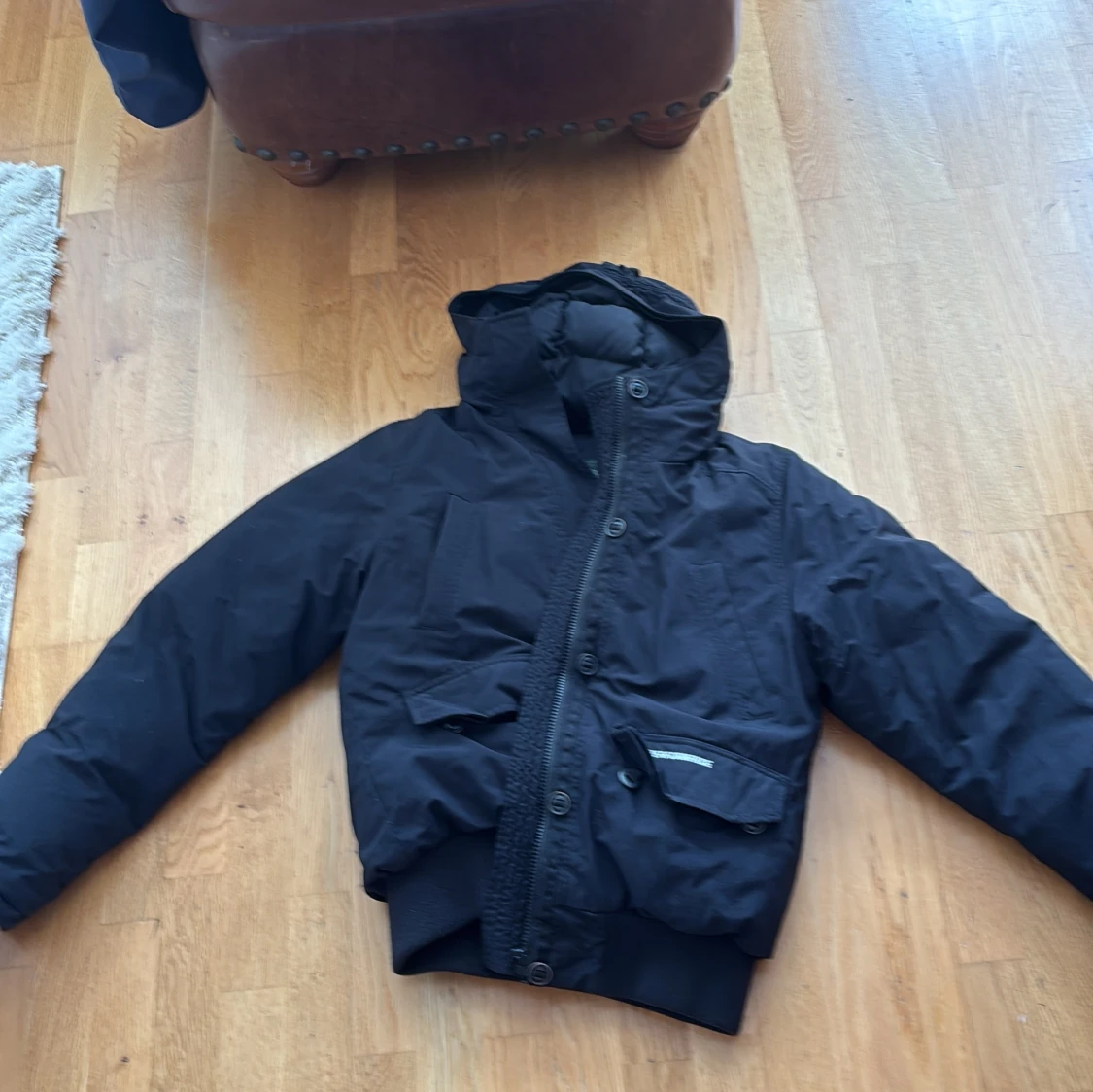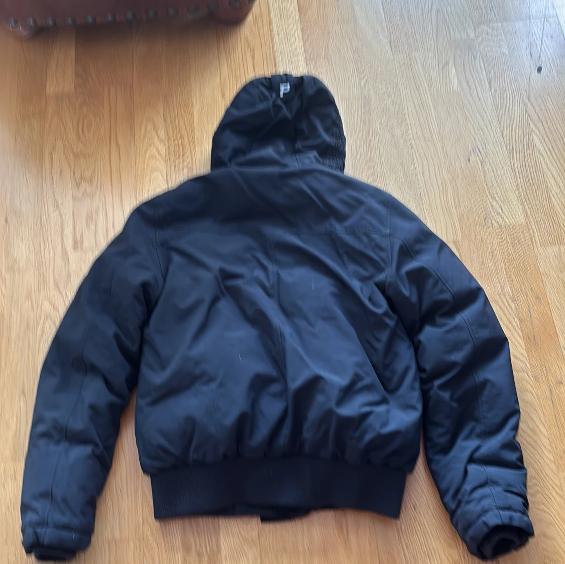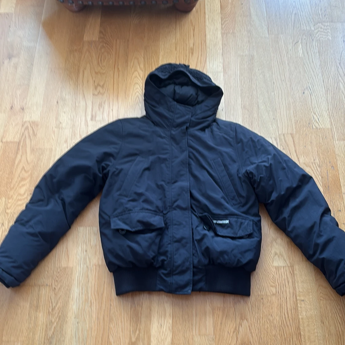 Svart dunjacka från Peak Performance med huva och bred mudd nertill. Jackan har två stora fickor framtill med lock och dragkedja, samt diskret logga på ena fickan. Perfekt för kalla dagar och har en klassisk, sportig look.