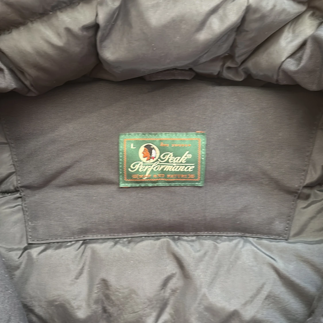 Svart dunjacka Peak Performance L väldigt liten i storleken så skulle säga SS