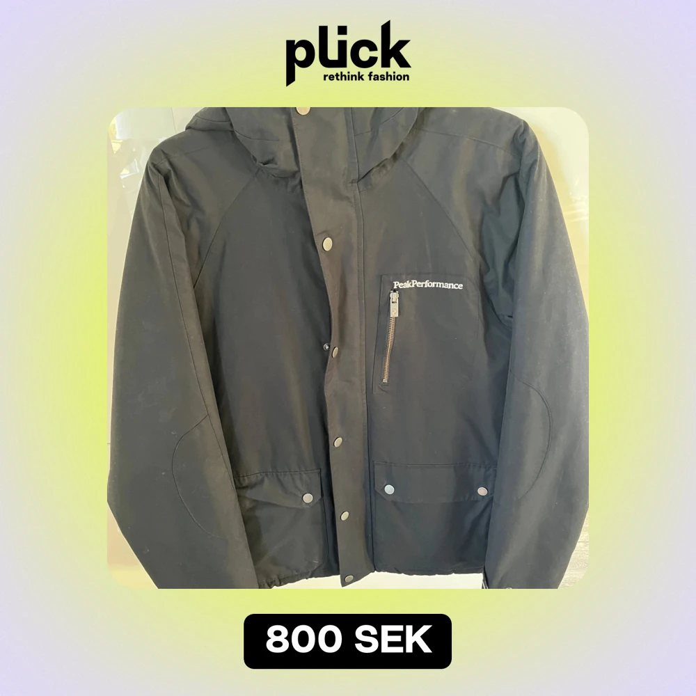 Säljer en svart jacka från Peak Performance i storlek L. Den har en dragkedja och knappar framtill, samt en praktisk bröstficka med dragkedja.