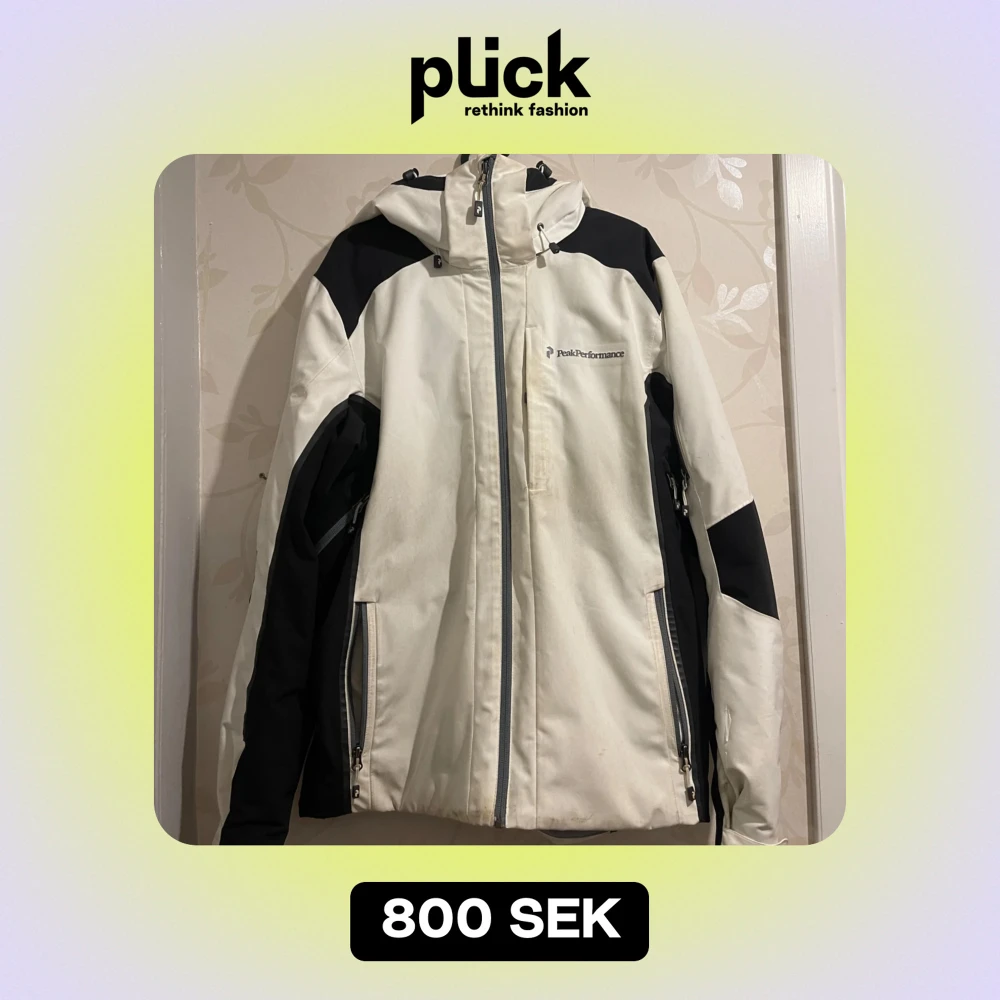 Säljer en snygg vit och svart jacka från Peak Performance. Den har en dragkedja framtill och praktiska fickor med dragkedjor. Perfekt för vintern med sin långa ärmar och huva. Jackan är bra för både skid/snowboardåkning.