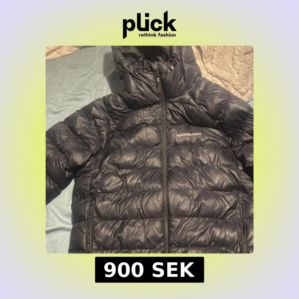 Säljer en svart dunjacka från Peak Performance i storlek M. Jackan har huva med justerbart band, två sidofickor med dragkedja och Peak Performance-logga på bröstet. Perfekt för kalla dagar med sin puffiga design och snygga look.