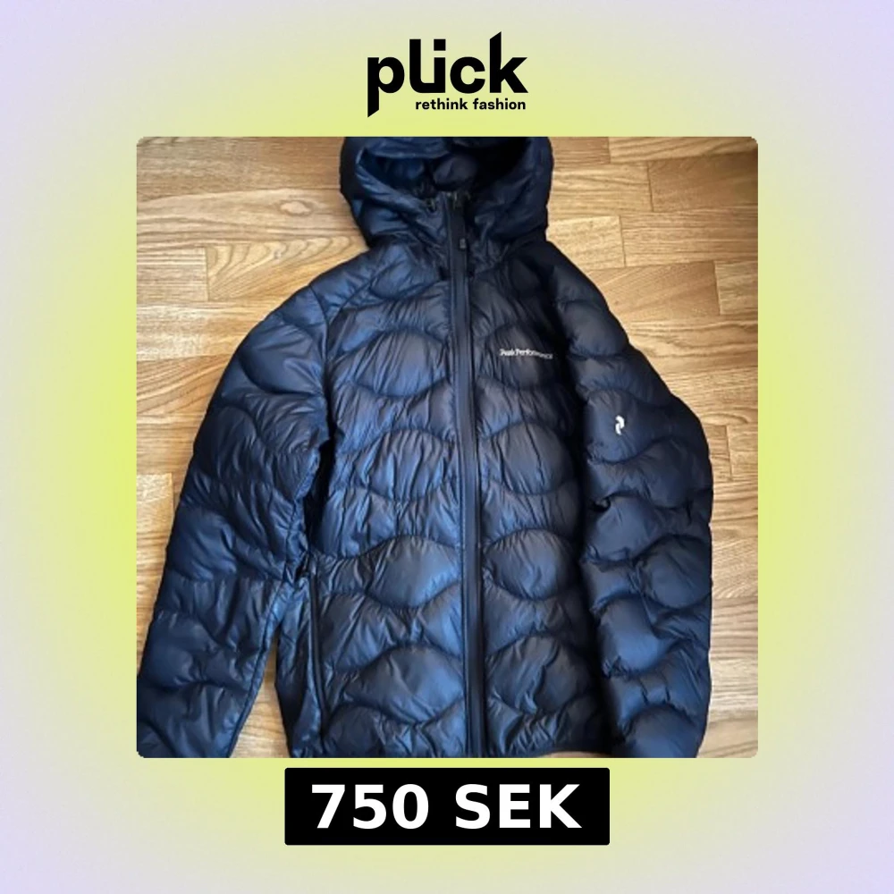 Säljer en svart dunjacka från Peak Performance. Jackan har en praktisk huva och dragkedja framtill.