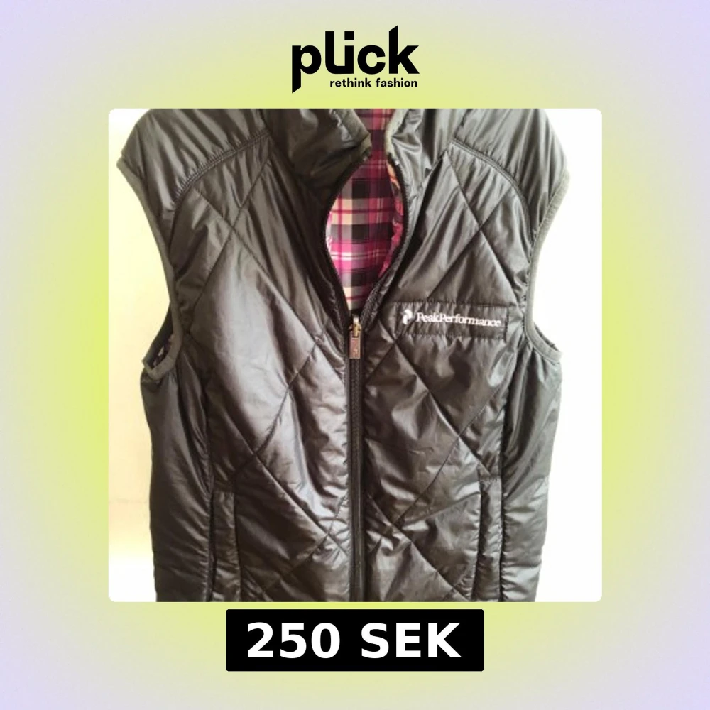 Snygg quiltad dunväst från Peak Performance med svart utsida och dragkedja. Insidan är fodrad i ett färgstarkt rutigt mönster i rosa, vit och svart. Västen har hög krage och är tillverkad i polyester. Perfekt för lager-på-lager och sportig stil. Vändbar modell.