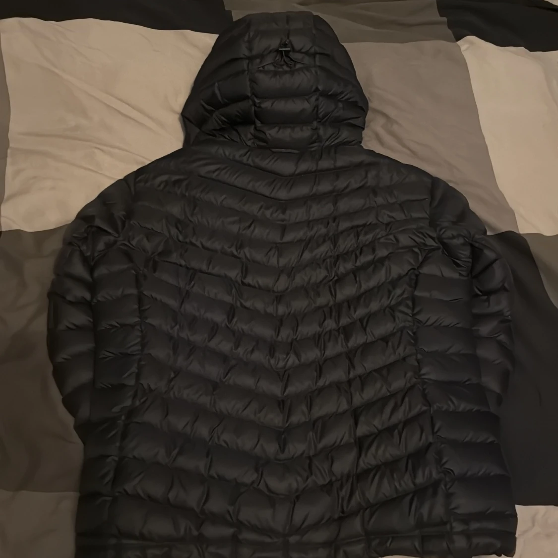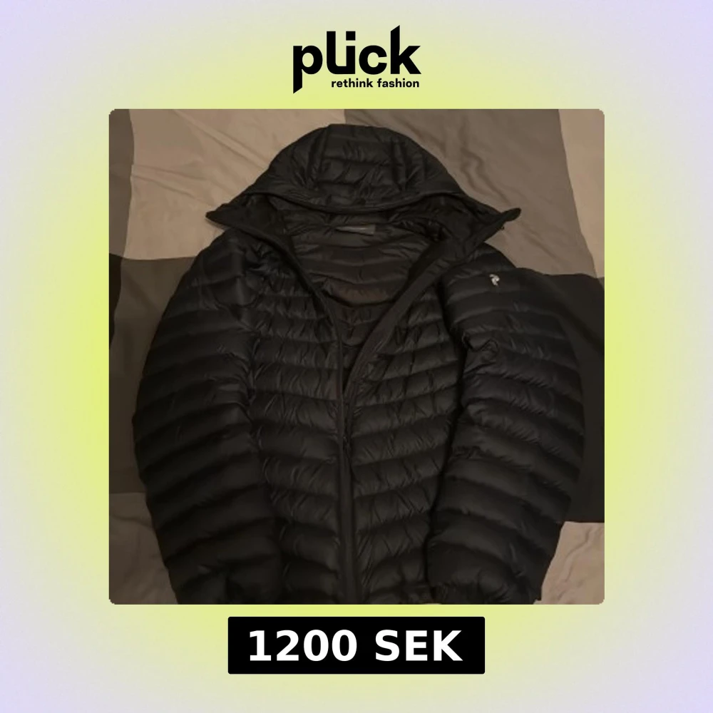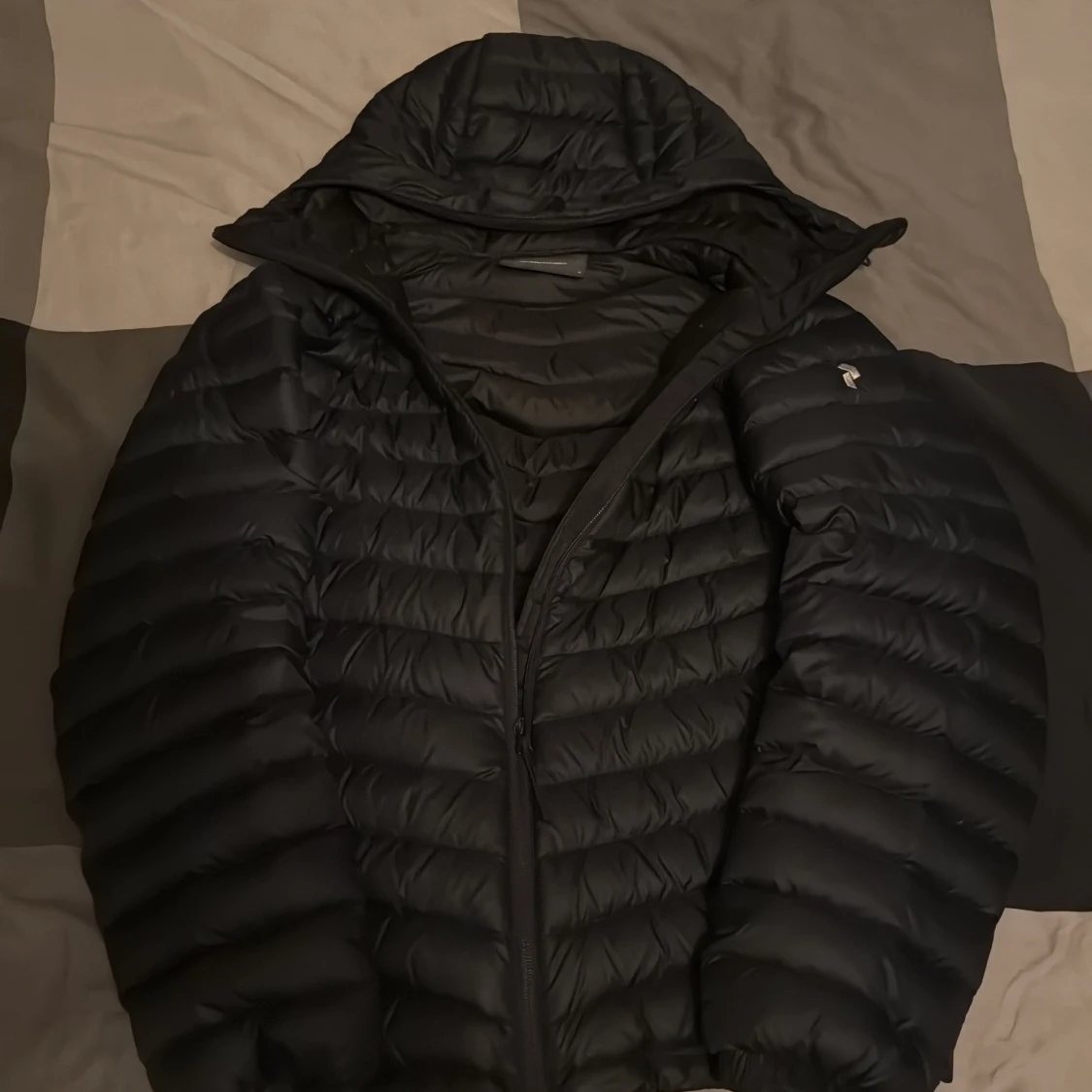 mörkblå dunjacka från Peak Performance i storlek M. Jackan har huva, quiltad design och dragkedja framtill. Perfekt för kyliga dagar och har en clean, sportig look. Passar dig som gillar stilrena och funktionella plagg.
