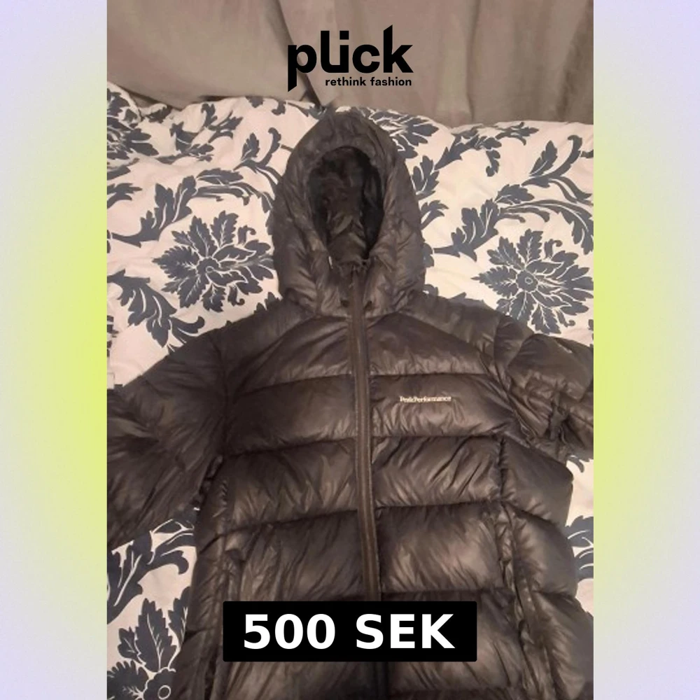 Svart dunjacka från Peak Performance med huva och dragkedja framtill. Jackan har en quiltad design med breda paneler och snörning vid huvan. Perfekt för kalla dagar och har en clean look som funkar till det mesta.