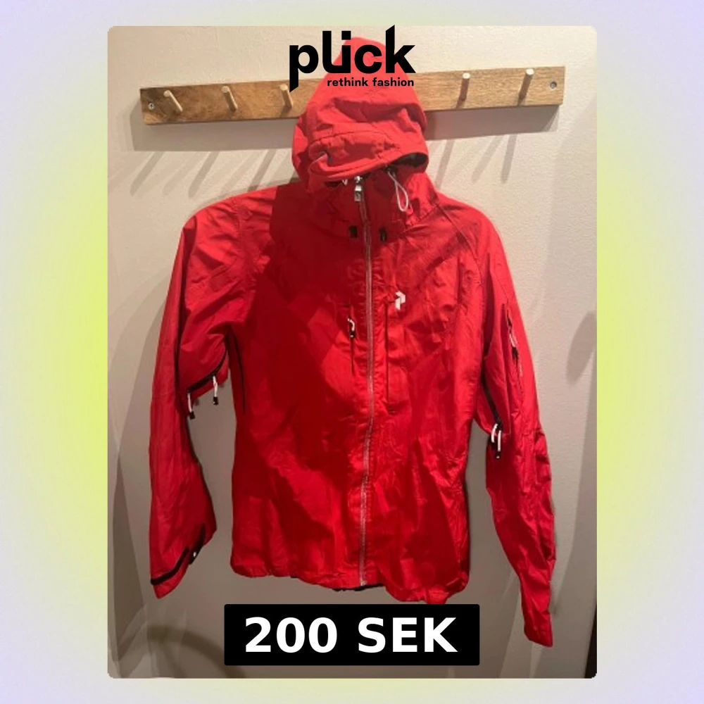 Röd skaljacka från Peak Performance med huva, dragkedja, flera praktiska fickor med dragkedjor och justerbara ärmslut. Det enda jag hittar är att dragkedjan fram är torkad (?) - därav pris. I övrigt bra skick.