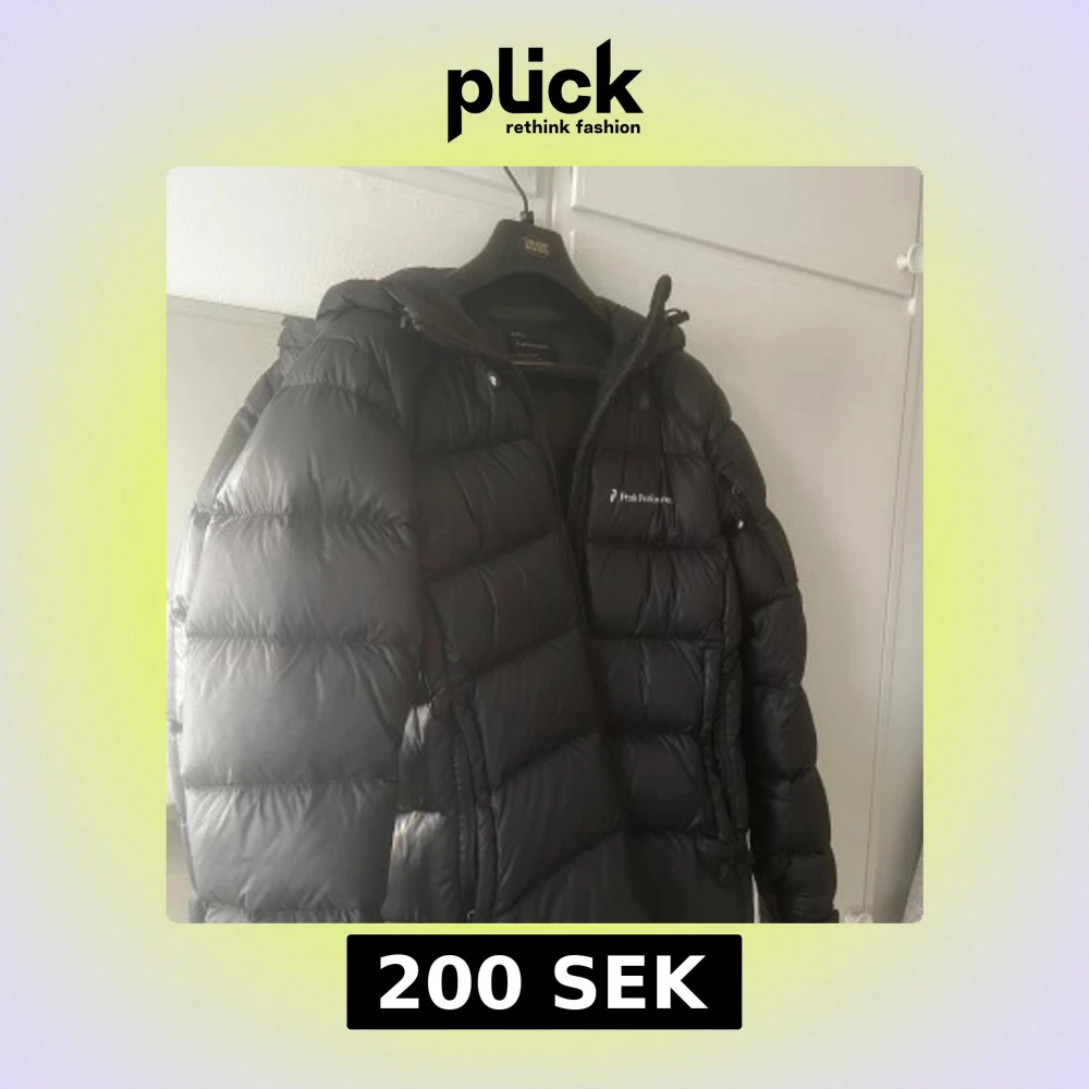 Snygg och varm svart dunjacka från Peak Performance. Jackan har en dragkedja framtill och en praktisk huva. Perfekt för kyliga dagar.