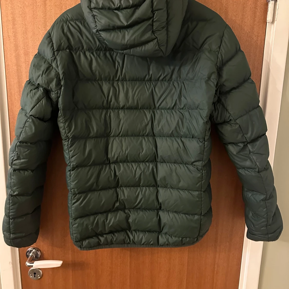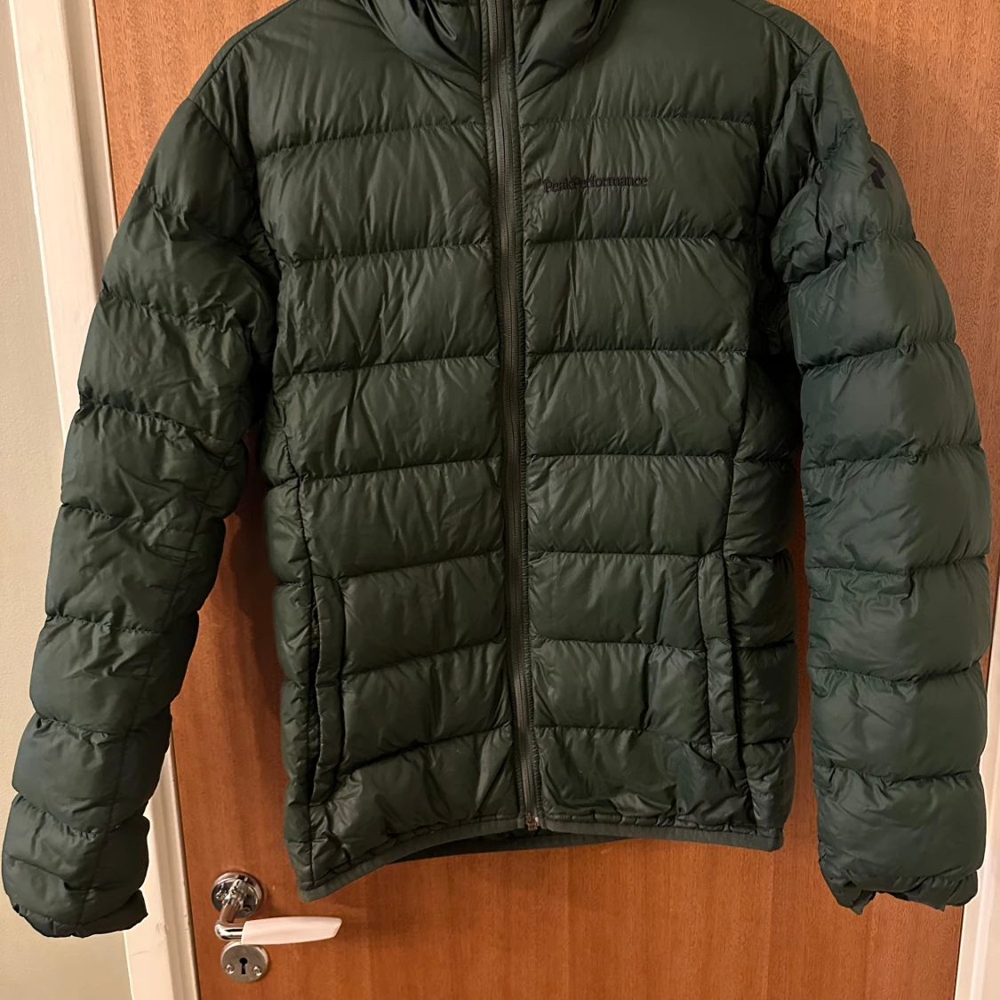 Mörkgrön dunjacka från Peak Performance med huva och dragkedja framtill. Jackan har quiltad design och är perfekt för kyliga dagar. Klassisk passform och diskret logga på bröstet och ärmen.