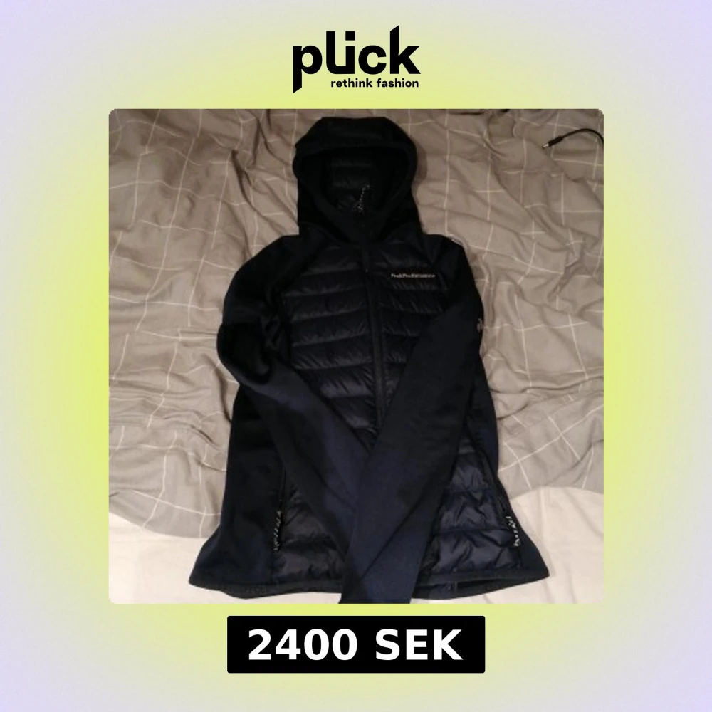 Snygg svart jacka från Peak Performance med huva och hybrid framsida och rygg pris kan diskuteras
